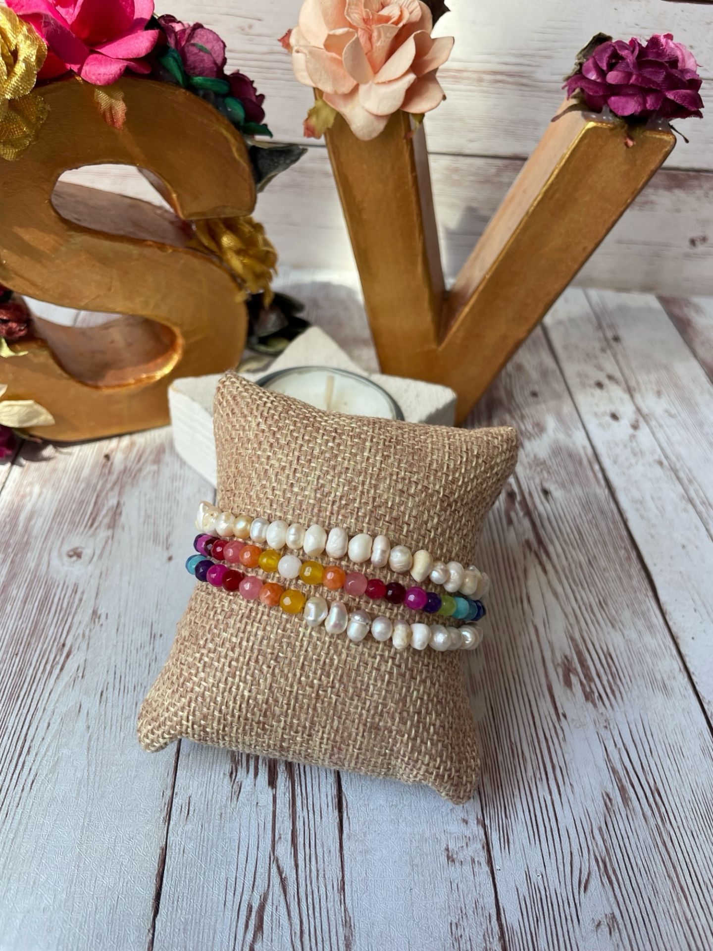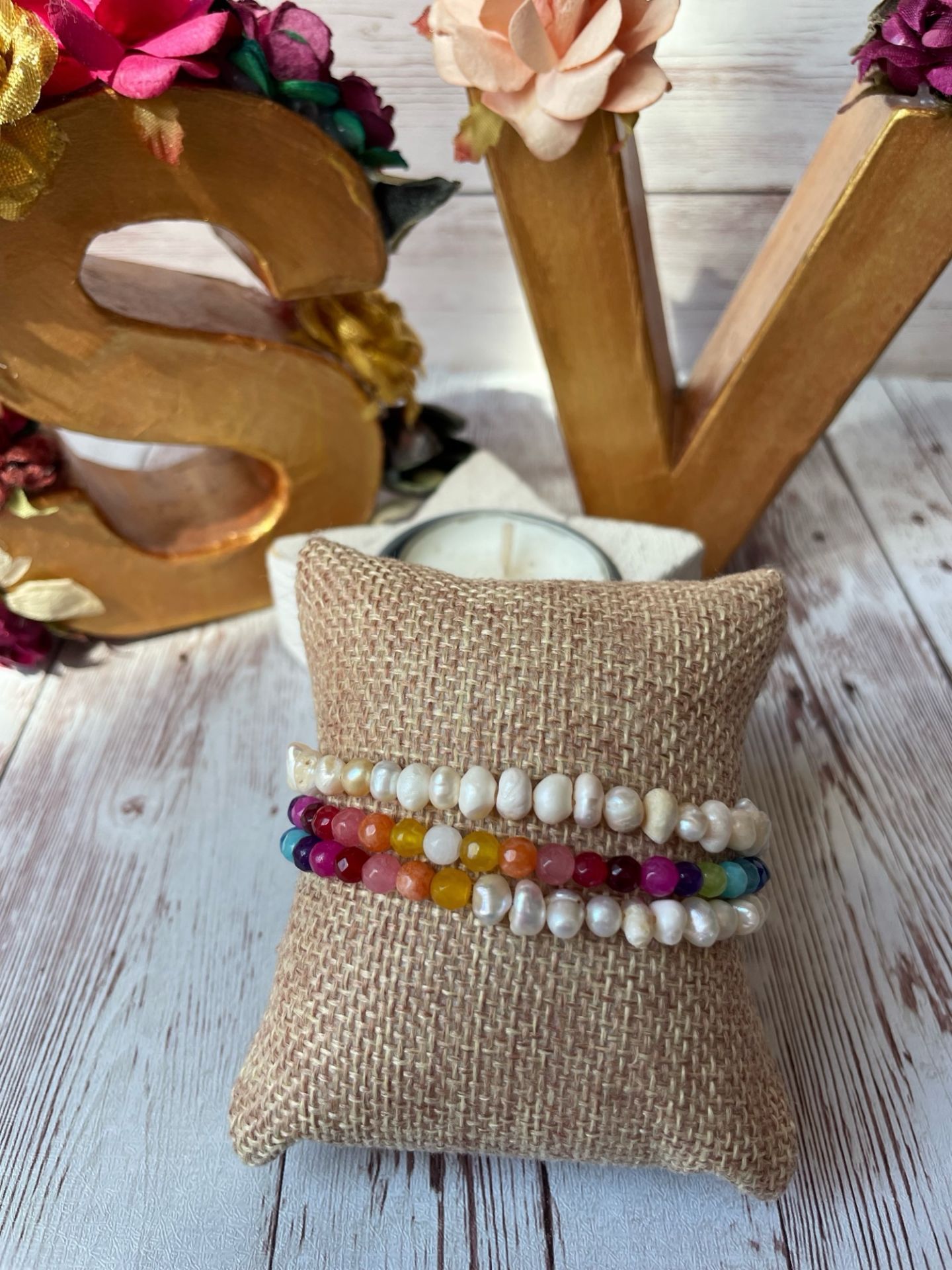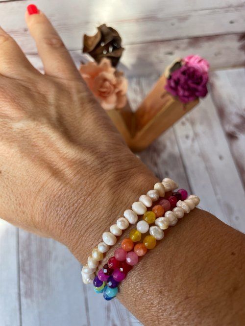 2) **Pulsera combinada:** mitad piedras de jade de colores y mitad perlas de río.