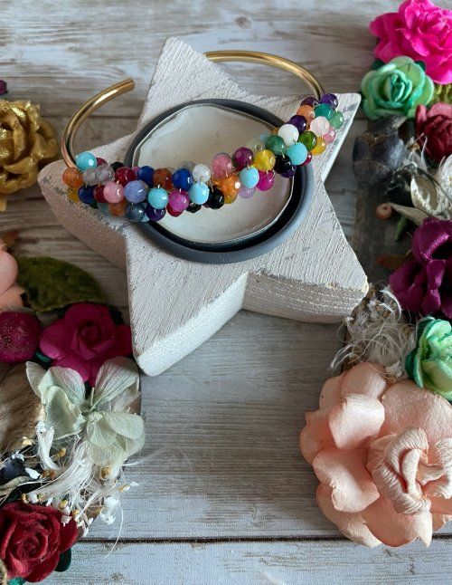 img 2083Brazalete rígido liso de acreo de titano chapado en oro de 18K engarzado con bolas de colores de jade. Es ajustable a la muñeca.