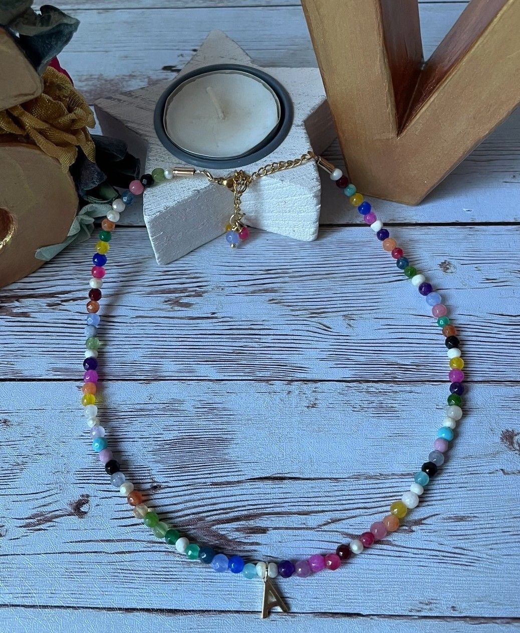 Collar hecho combinando bolas naturales de colores de jade y perlas de río con colgante de cobre bañado en dorado y charm de inicial.