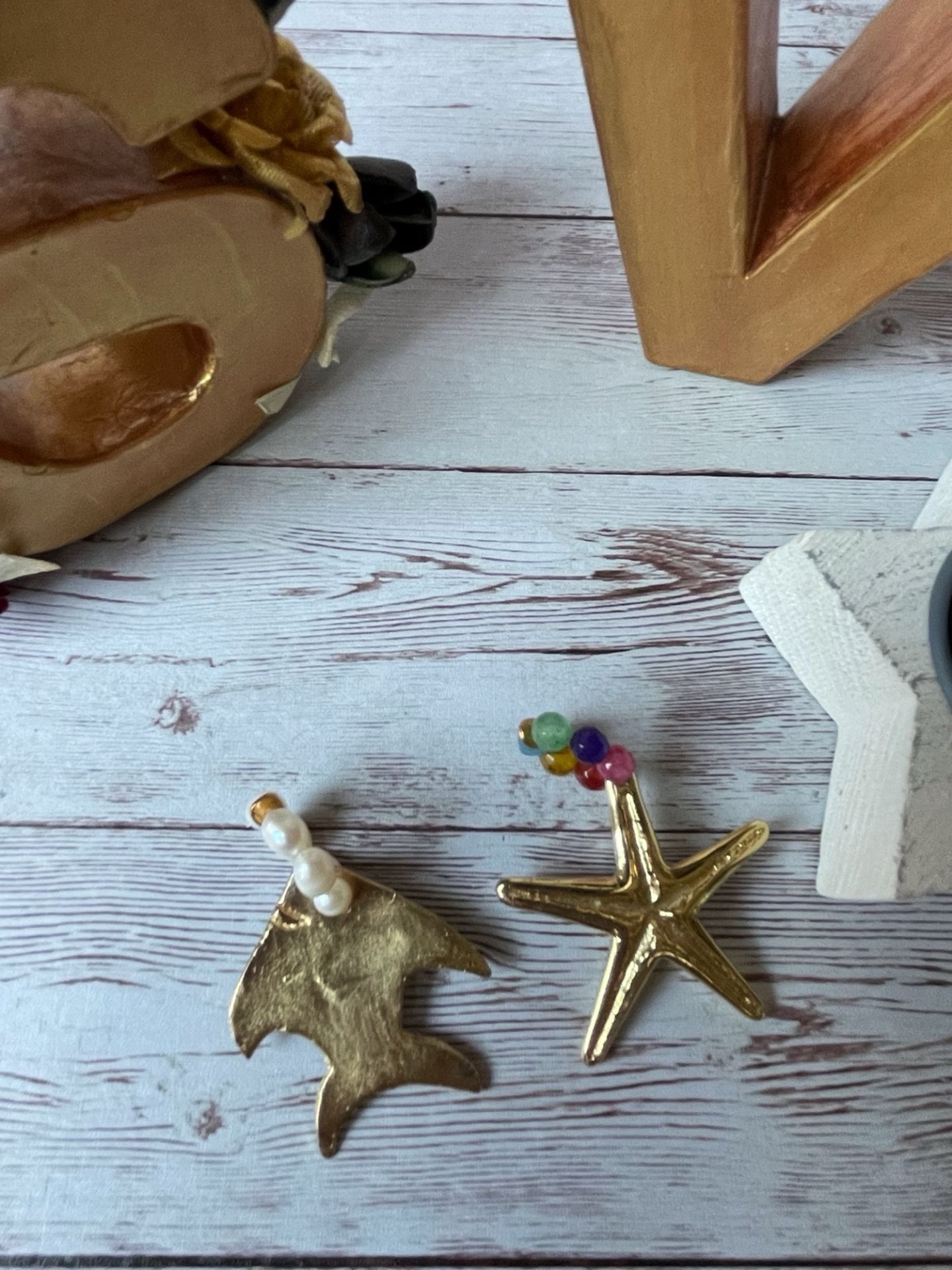 Collar largo de unos 78 cm aporxiamdamente, elaborado con tres cordones de bolas de jade de colores: dos de 4mm y uno de 6mm. Incluye dos colgantes de acero inoxidable bañado en dorado: una estrella y un tiburón.