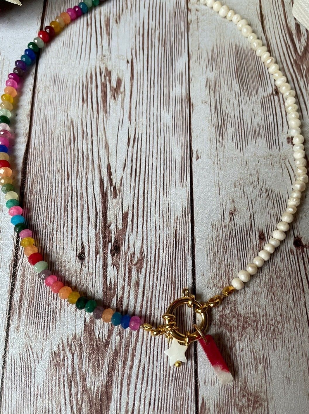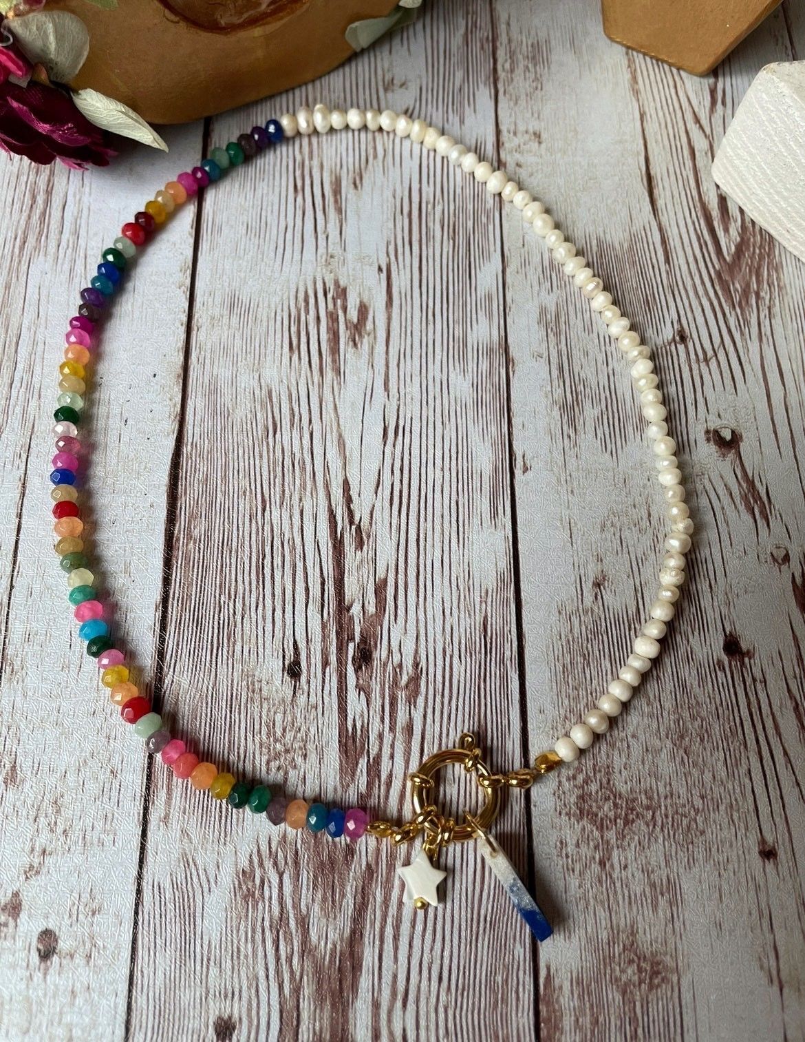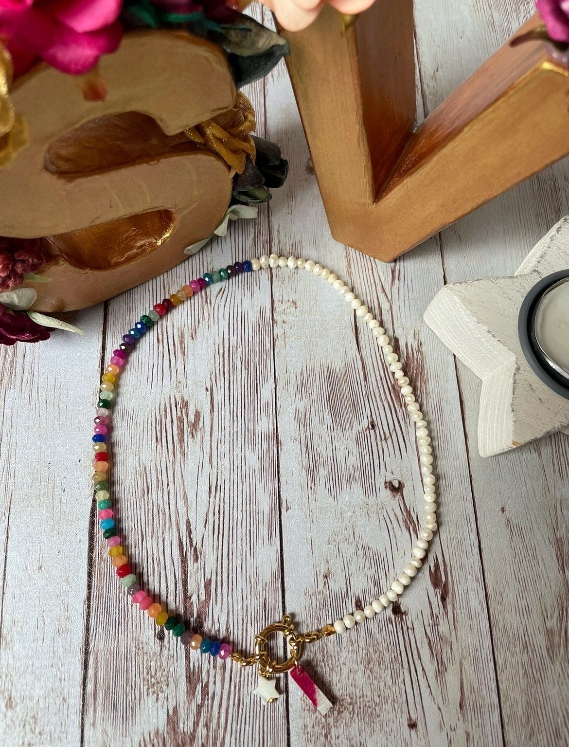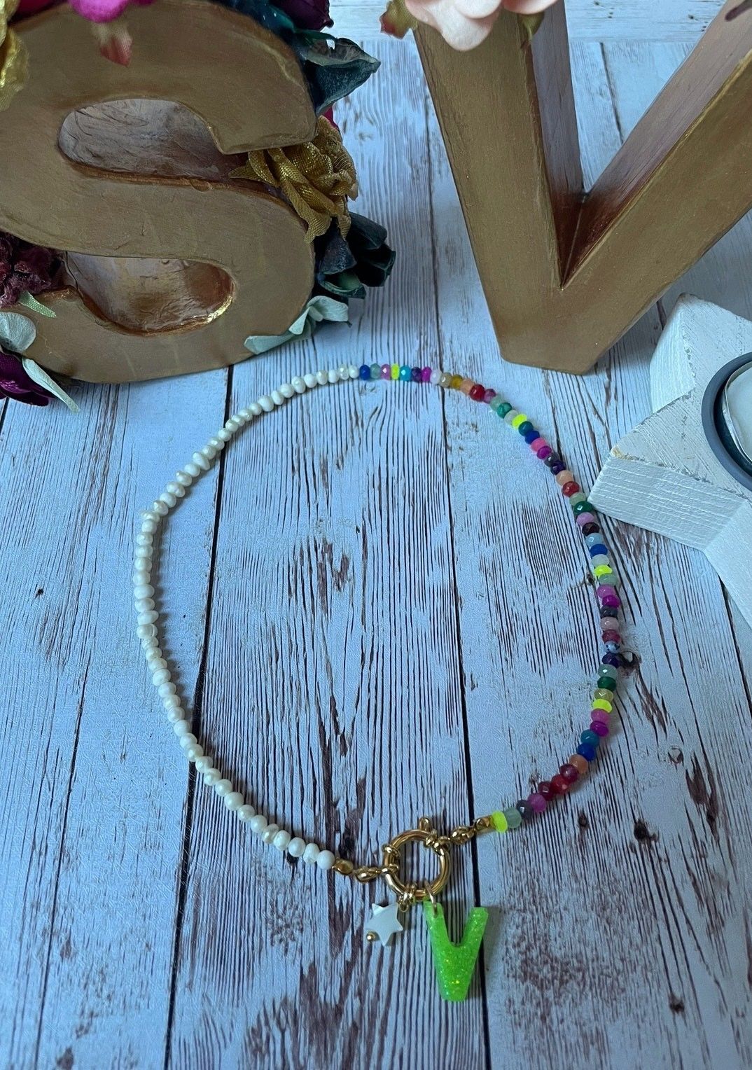 1.jpgCollar hecho con bolas naturales de colores de jade y perlas de río con cierre de mosquetón en acero inoxidable chapado en oro. Del cierre cuelga una estrellita de nácar y la inicial.