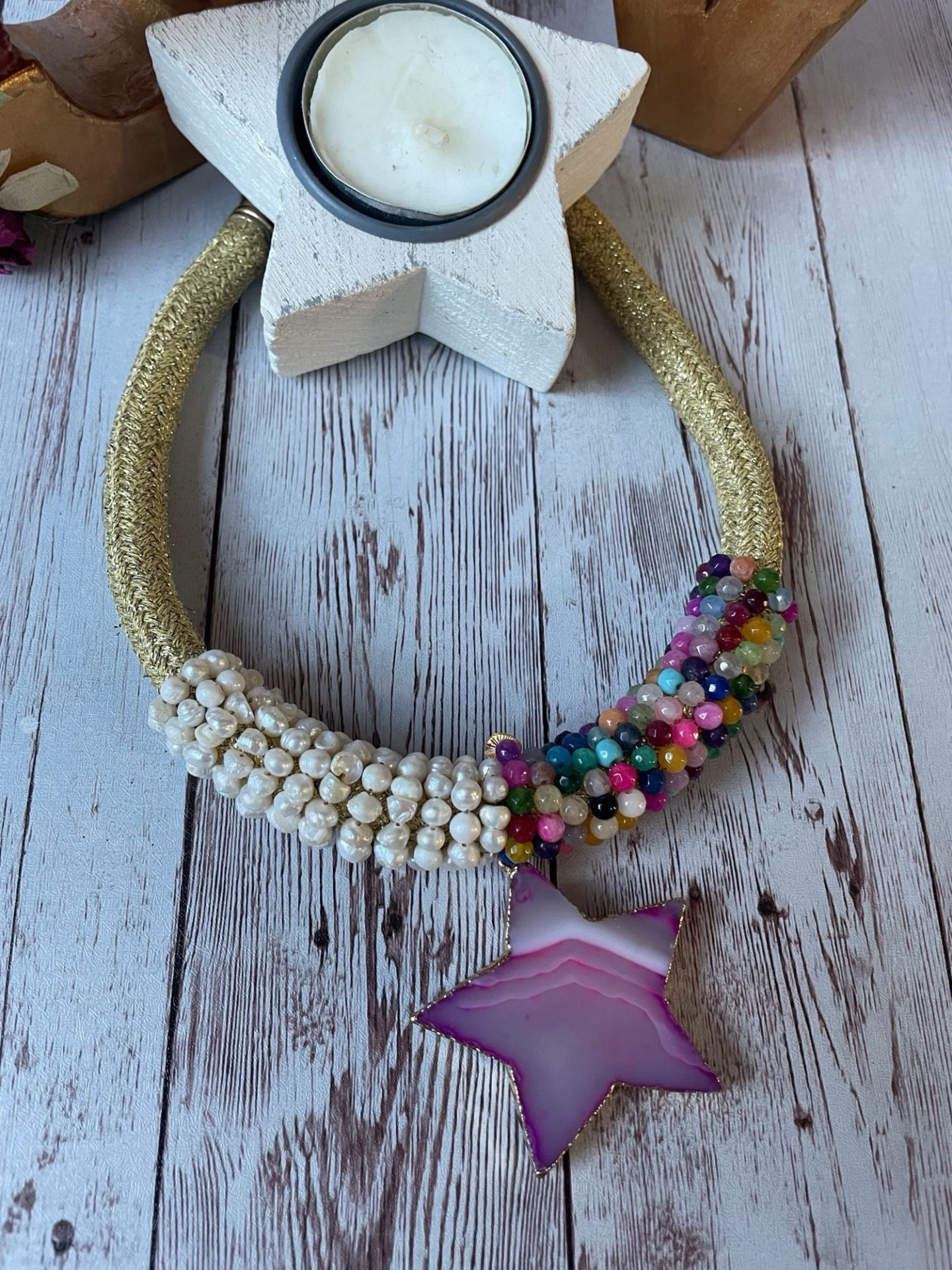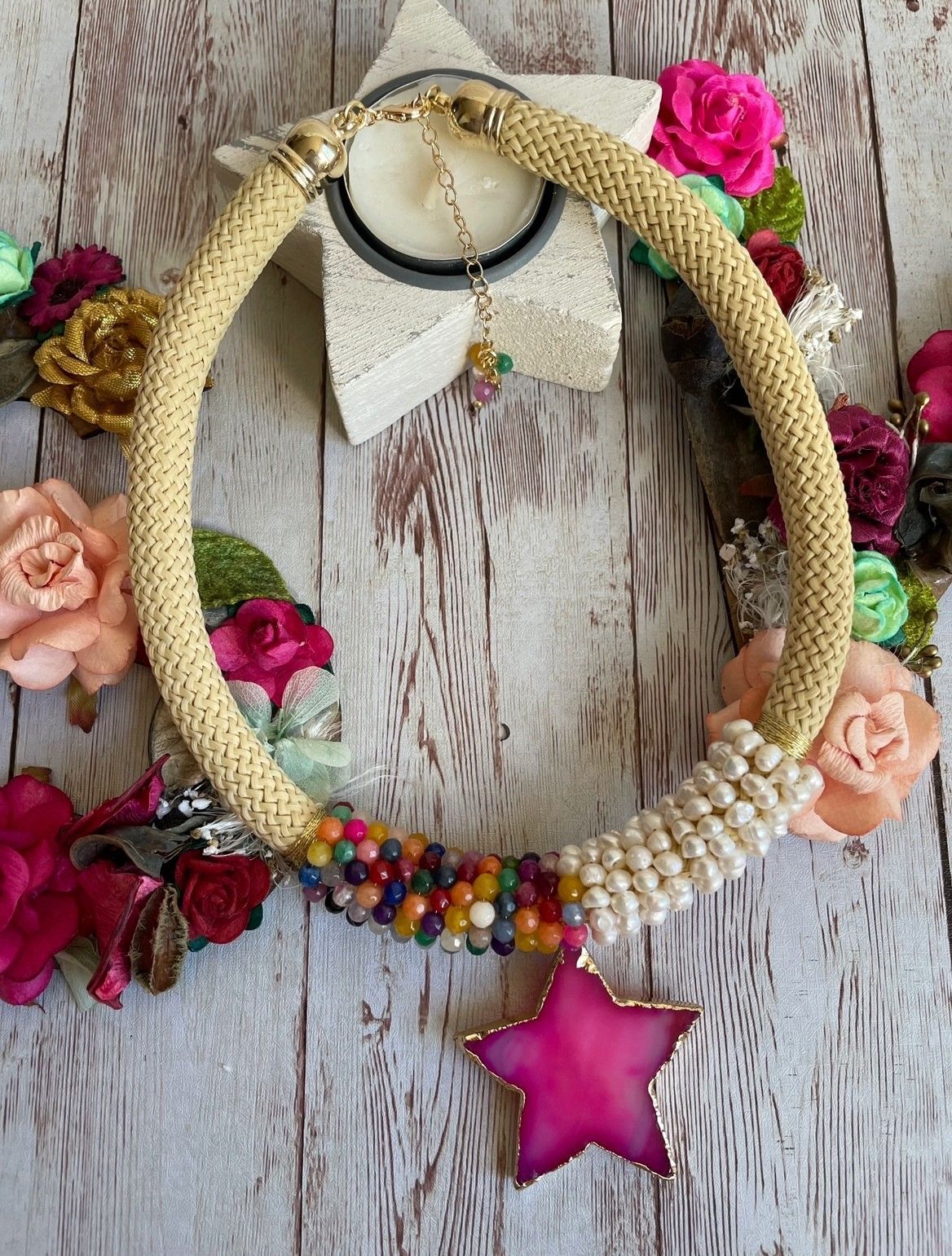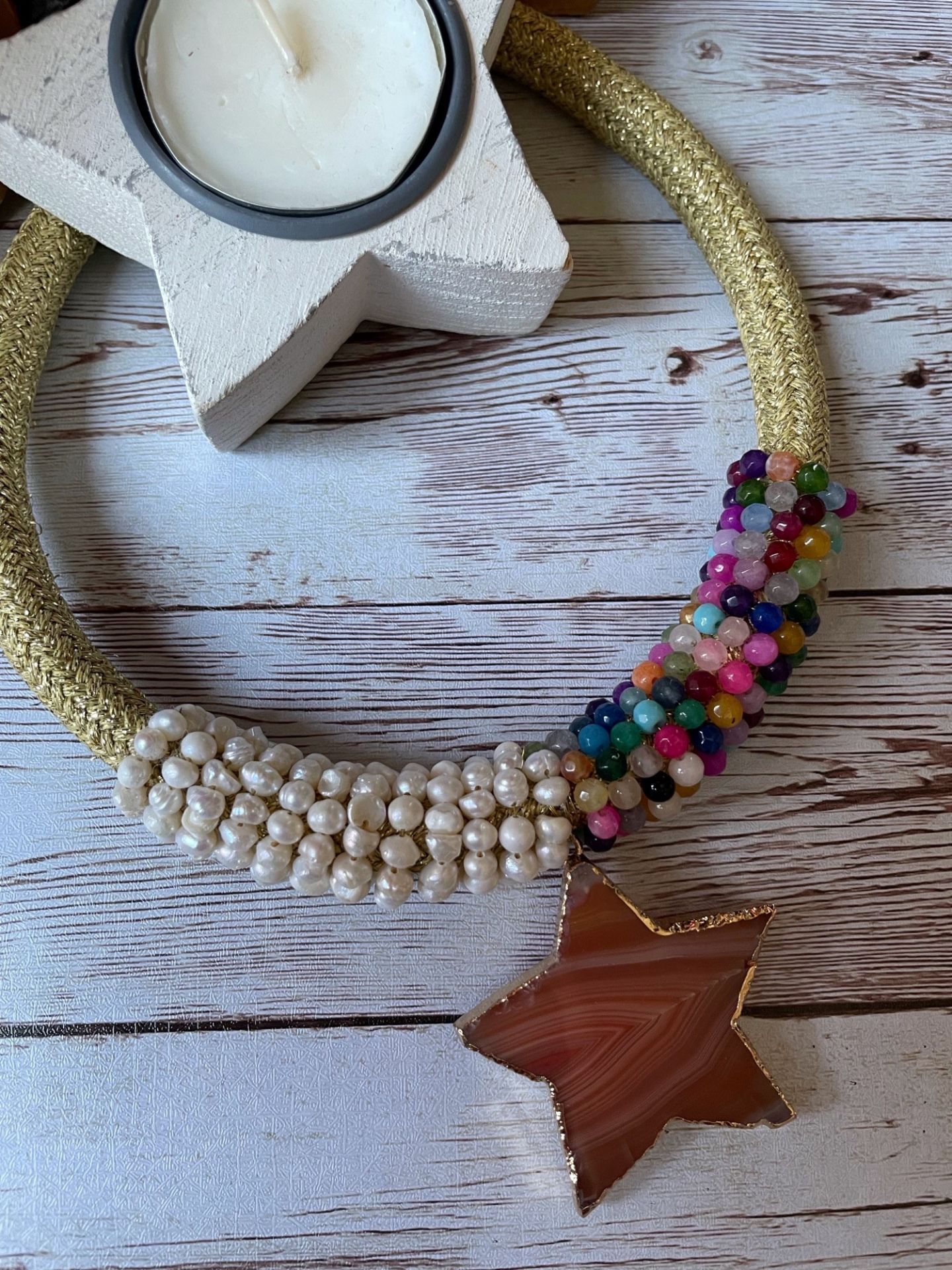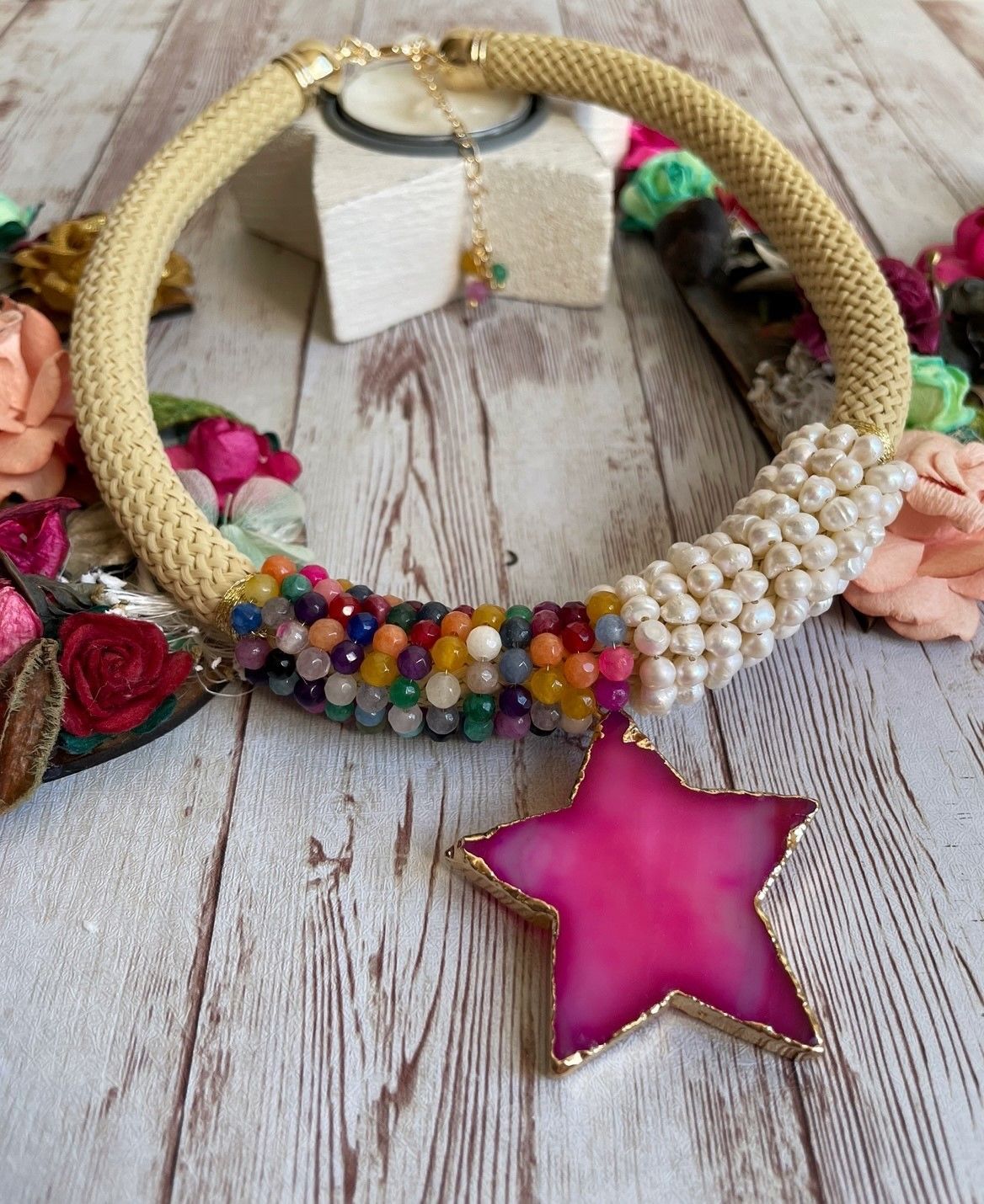 Descubre este hermoso collar artesanal, elaborado con cuerda de paracord en tono crudo o dorado, decorado con elegantes bolas de jade de colores y perlas de río. El toque especial lo aporta su colgante de piedra natural o dorado, como por ejemplo la estrella.