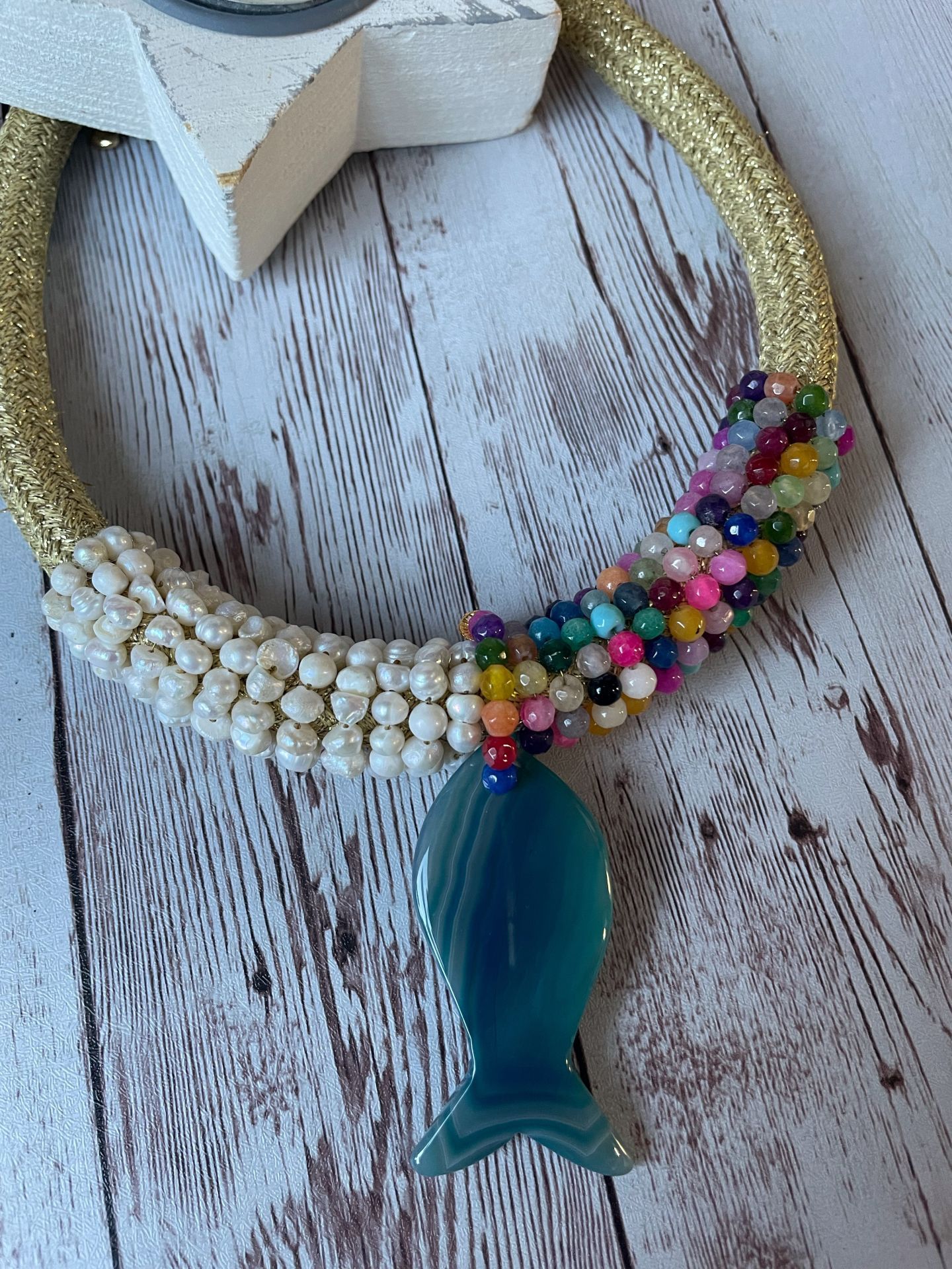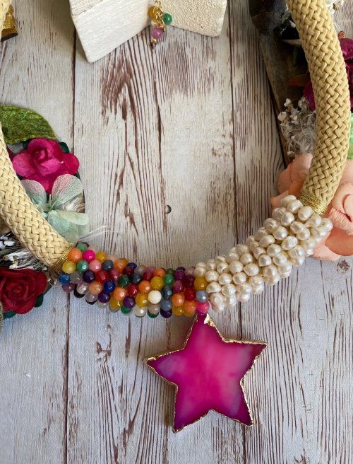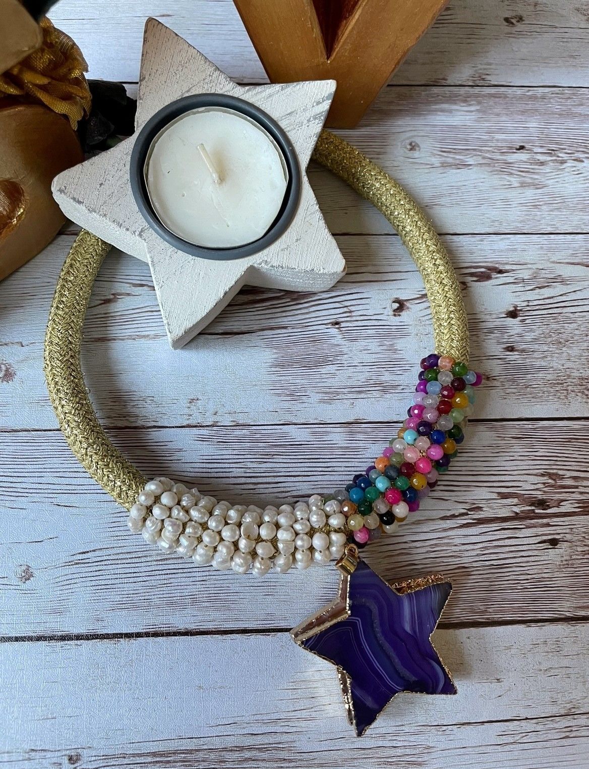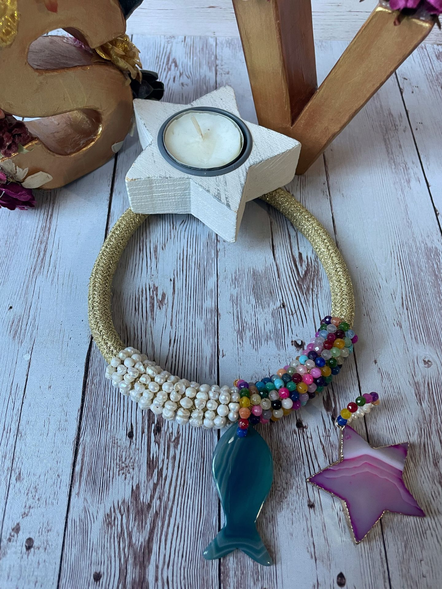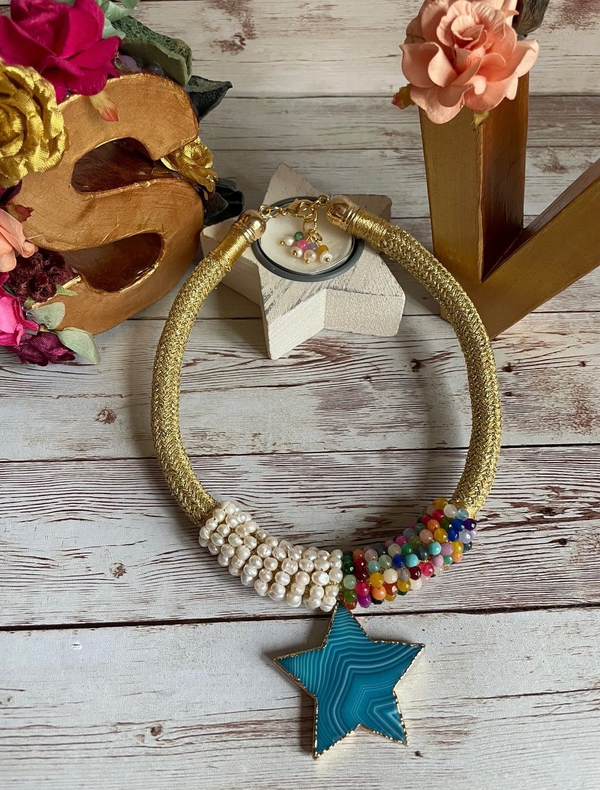 Descubre este hermoso collar artesanal, elaborado con cuerda de paracord en tono crudo o dorado, decorado con elegantes bolas de jade de colores y perlas de río. El toque especial lo aporta su colgante de piedra natural o dorado, como por ejemplo la estrella.