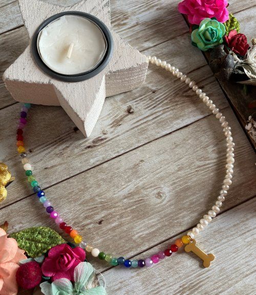 Collar hecho con bolas naturales de colores de jade y perlas de río con colgante huesito de acero inoxidable chapado en dorado y letra de circonitas cúbicas.