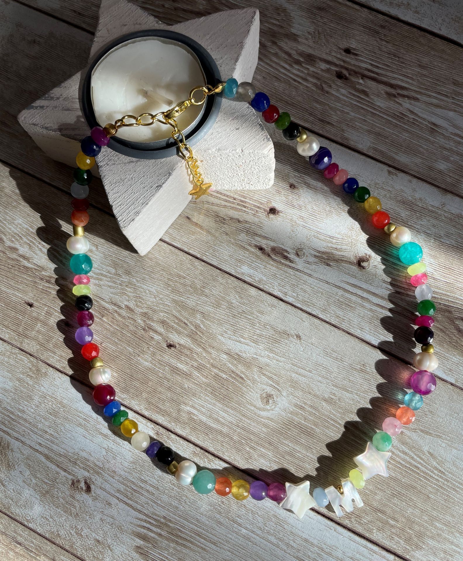 Collar hecho con bolas naturales de colores de diferentes tamaños (jade/ágata) y perlas de río.