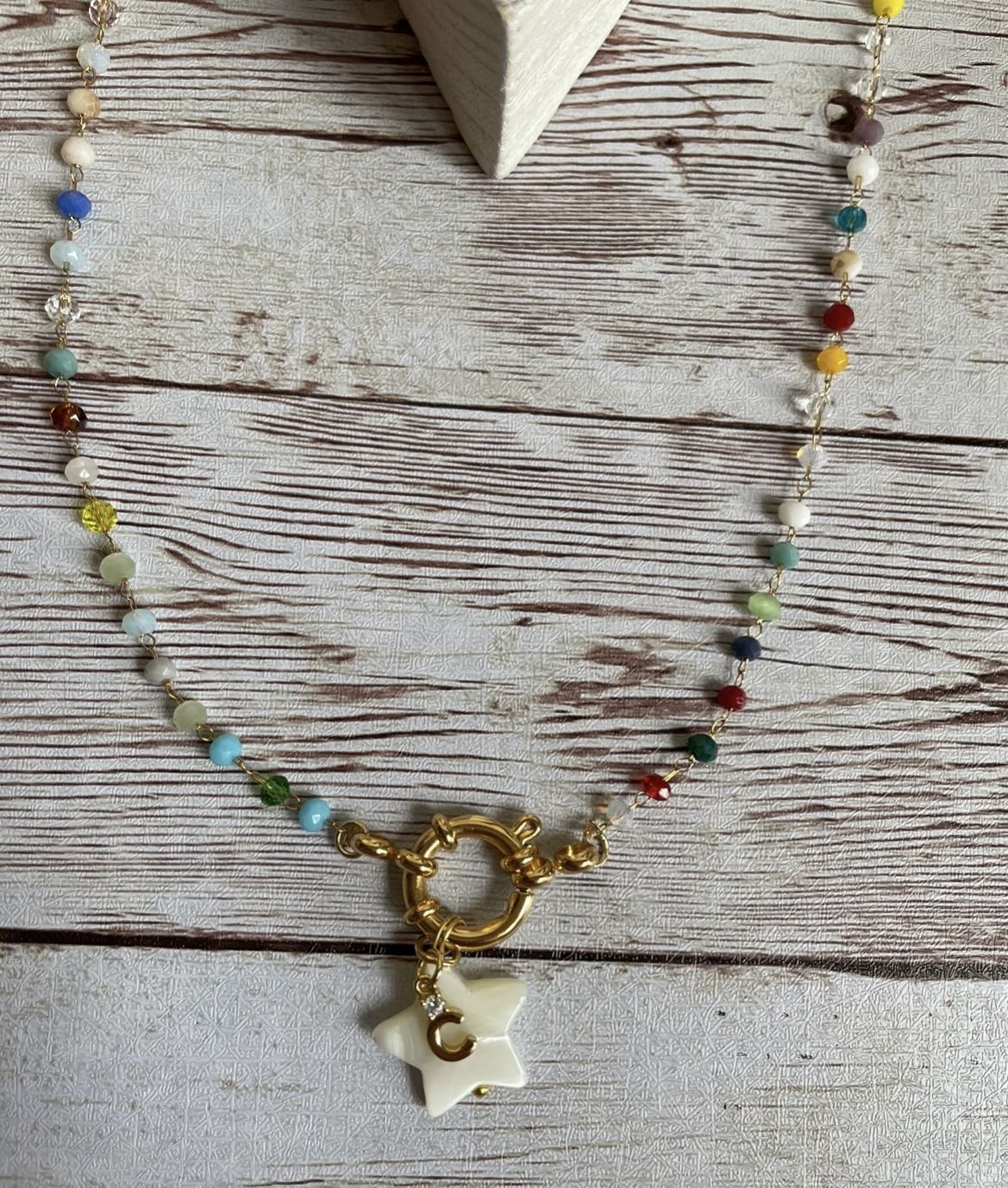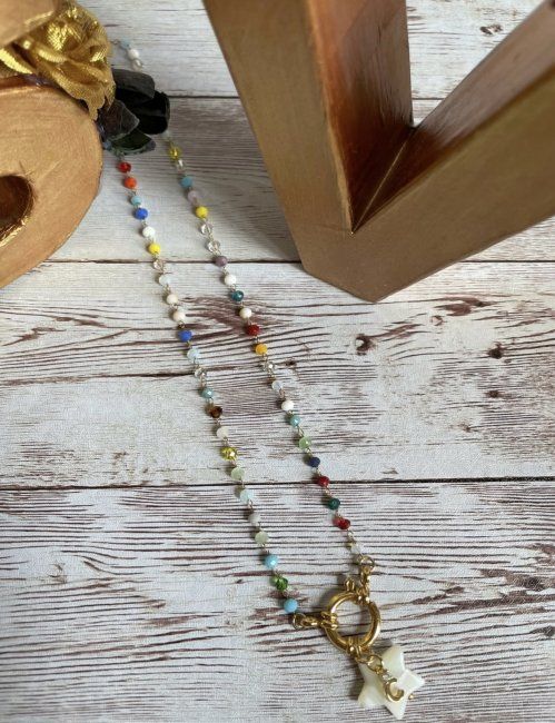 Collar hecho con cadena y cierre de resorte en acero inoxidable chapado en oro 24k con colgantes.