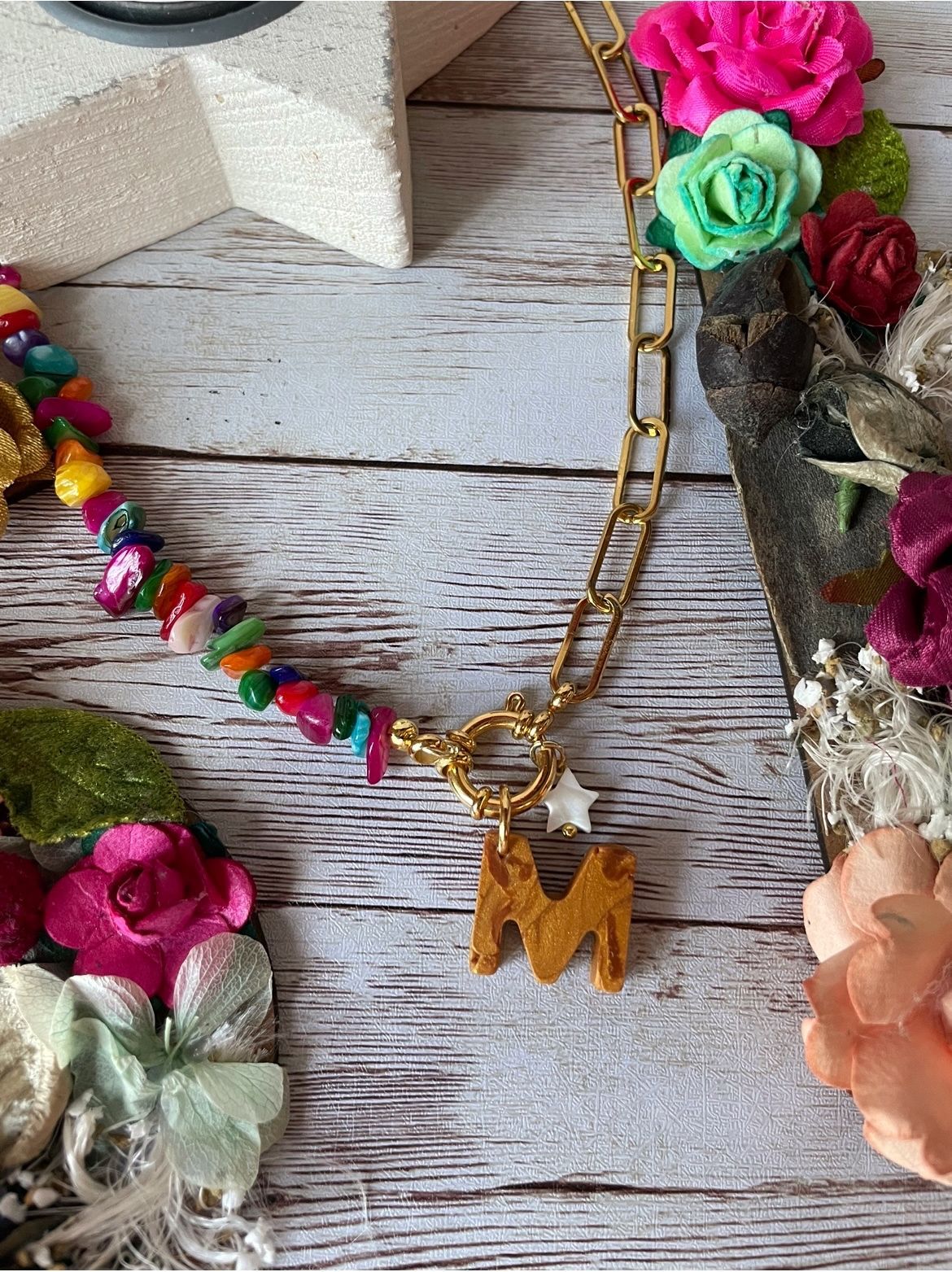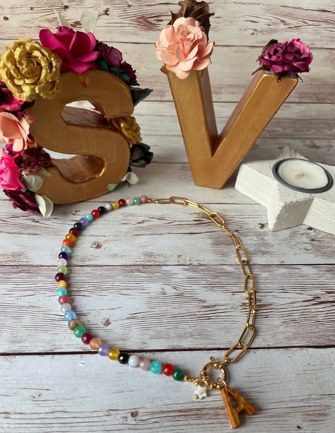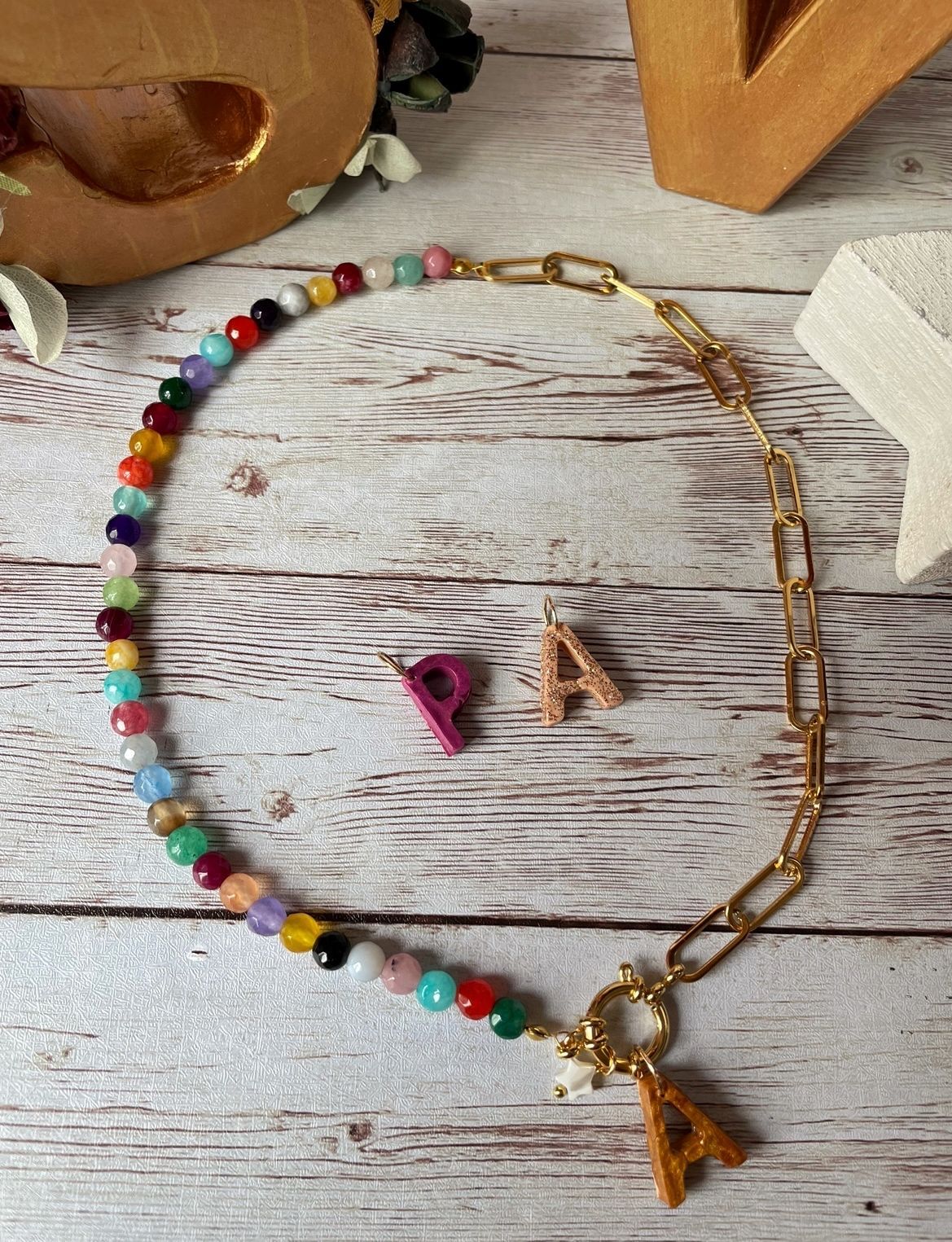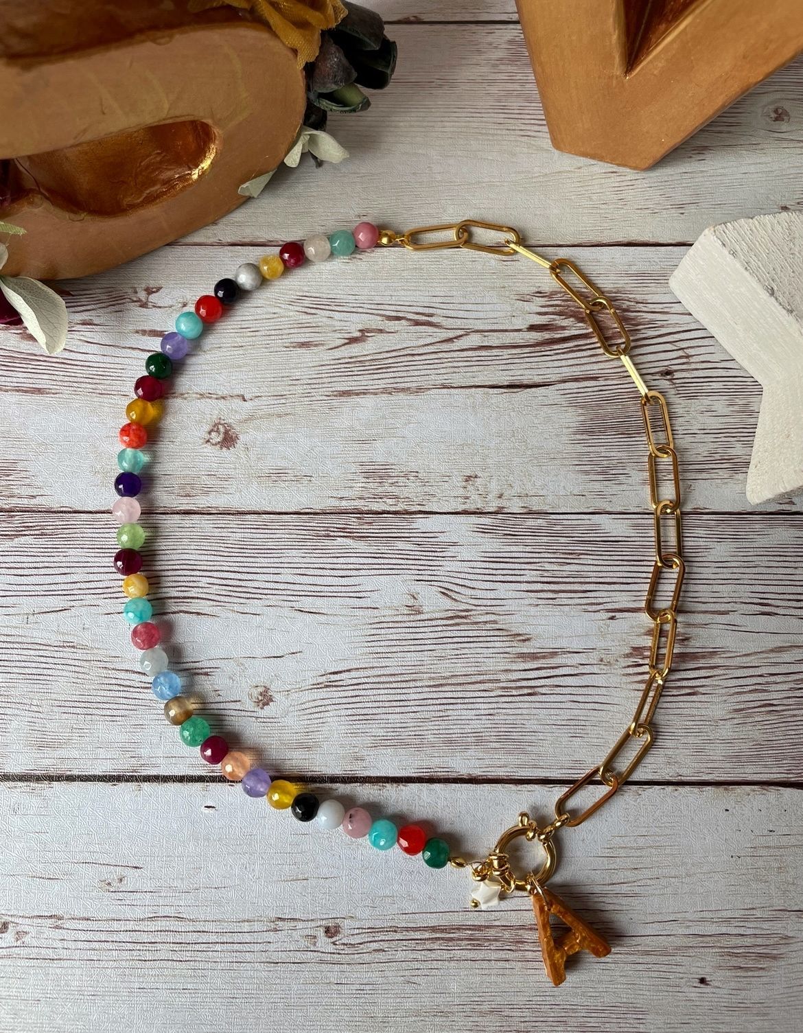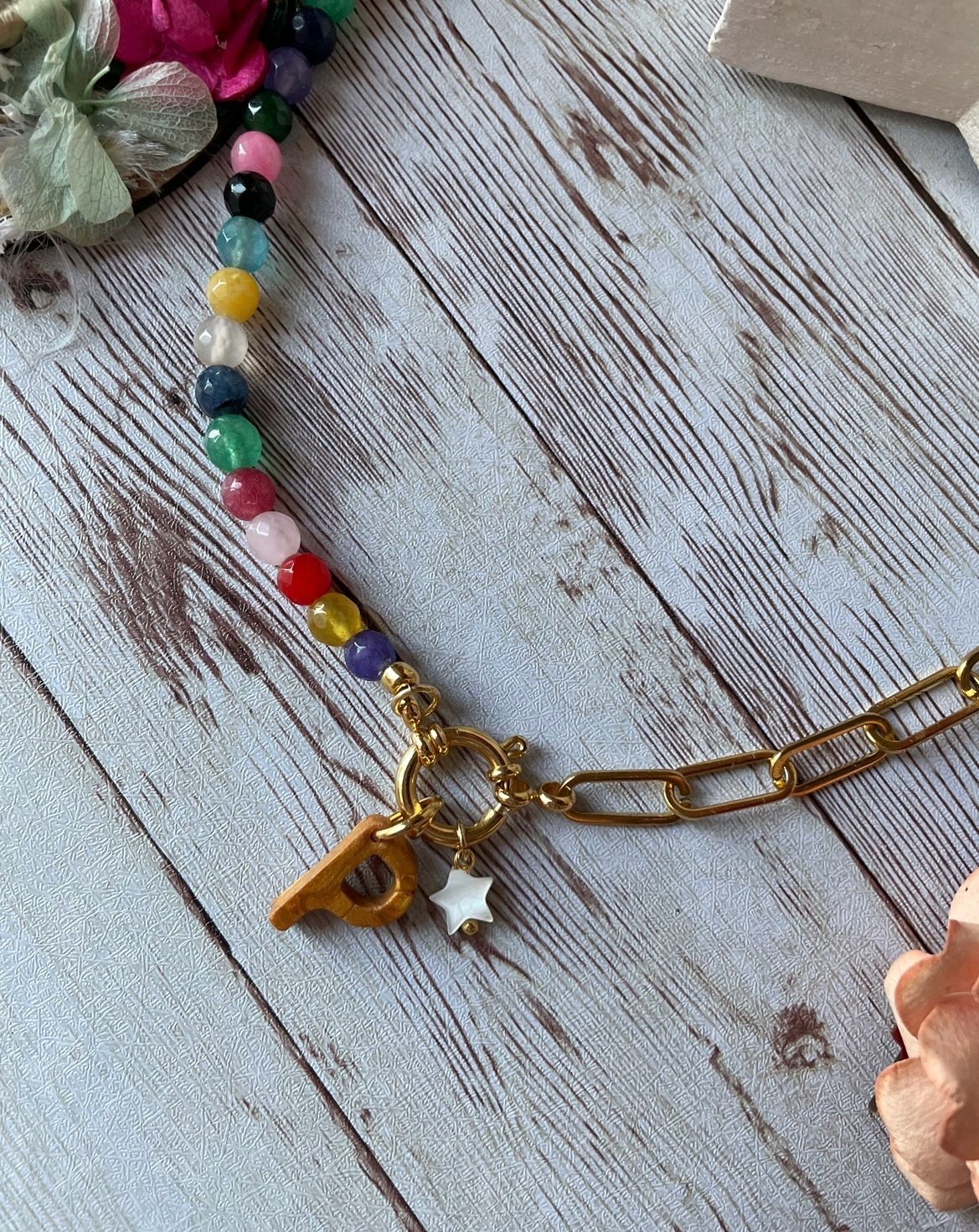 Collar hecho con bolas de piedras naturales de jade de colores, cadena de acero inoxidable en dorado y cierre de mosquetón de acero inoxidable chapado en oro. Del cierre cuelga una estrellita de nácar y la inicial.