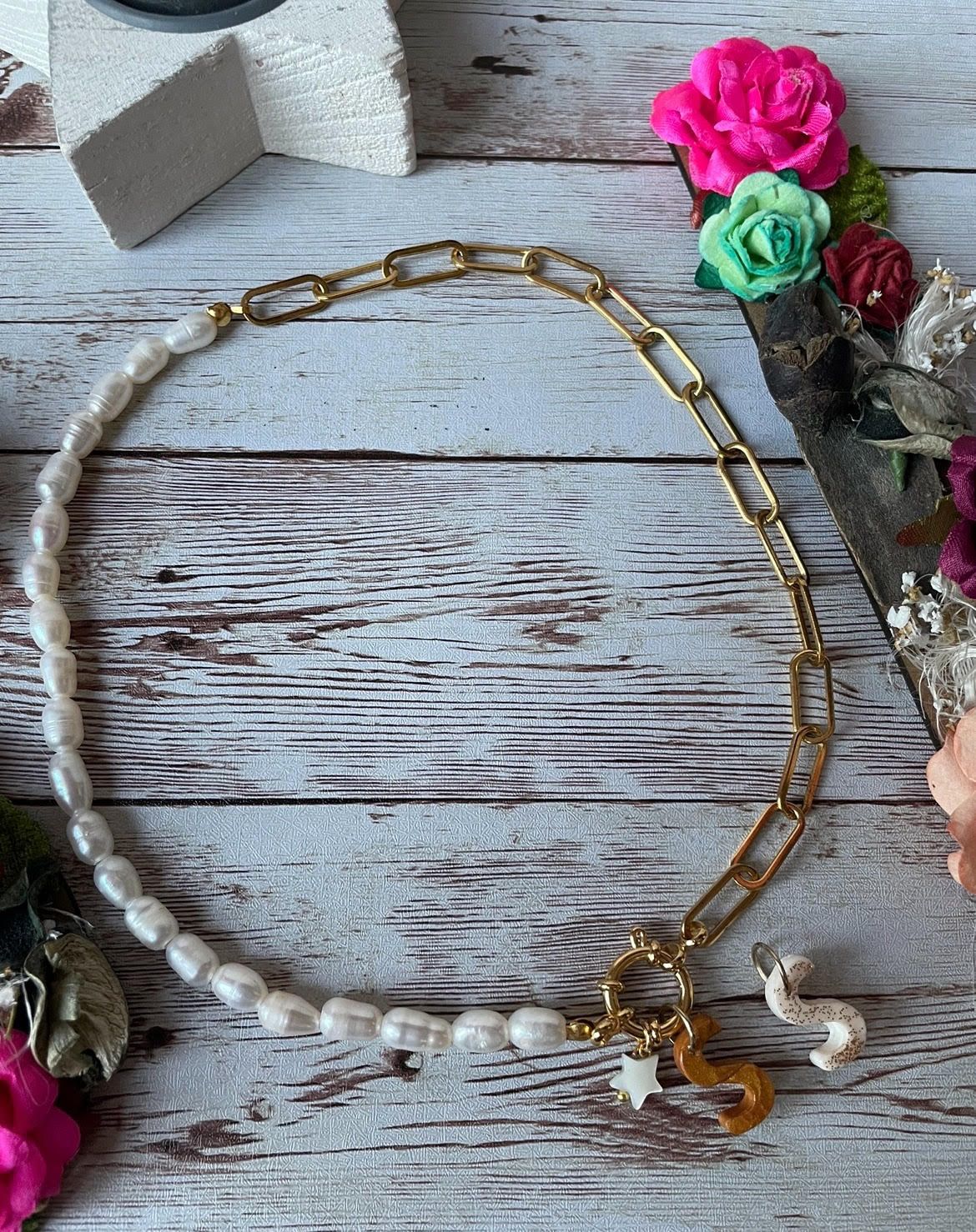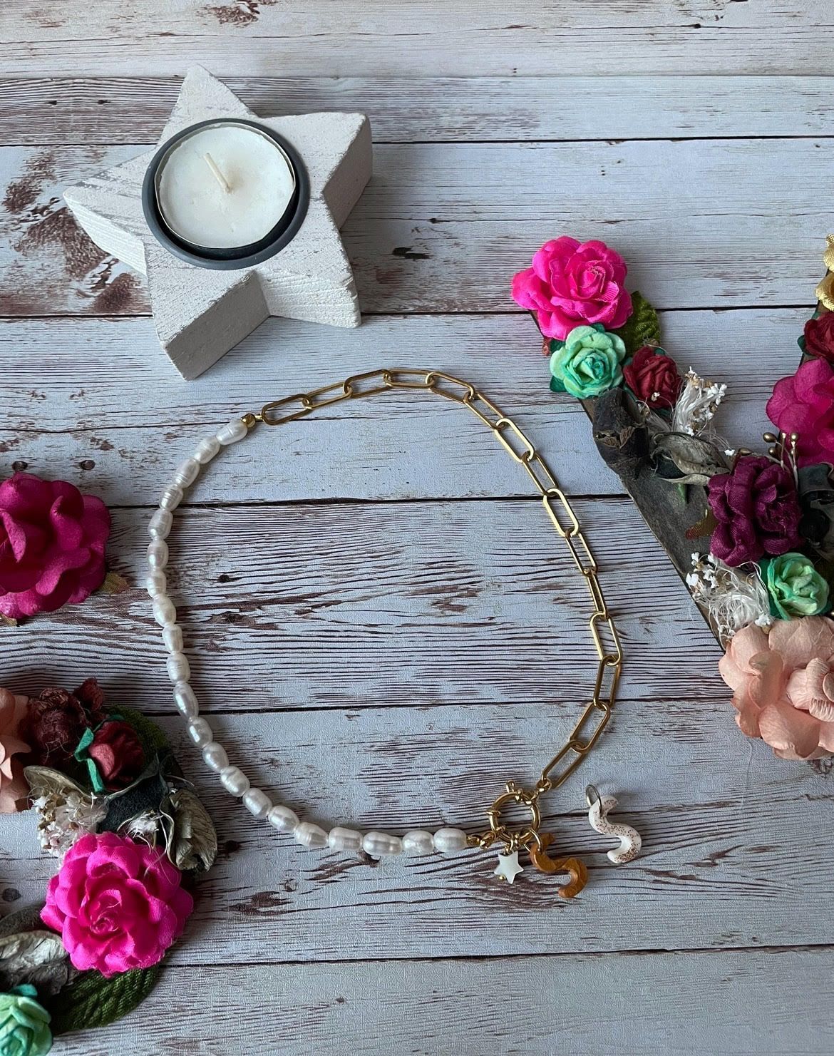 Collar hecho con perlas natuales de río, cadena de acero inoxidable en doradoy cierre de mosquetón de acero inoxidable chapado en oro. Del cierre cuelga una estrellita de nácar y la inicial.