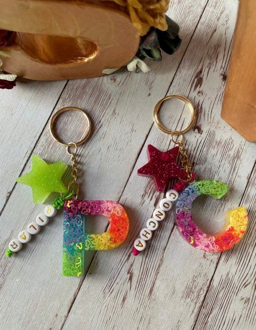 Llavero hecho a mano con resina époxica, confeti y purpurina de colores flúor. La estrella también está hecha con resina.
