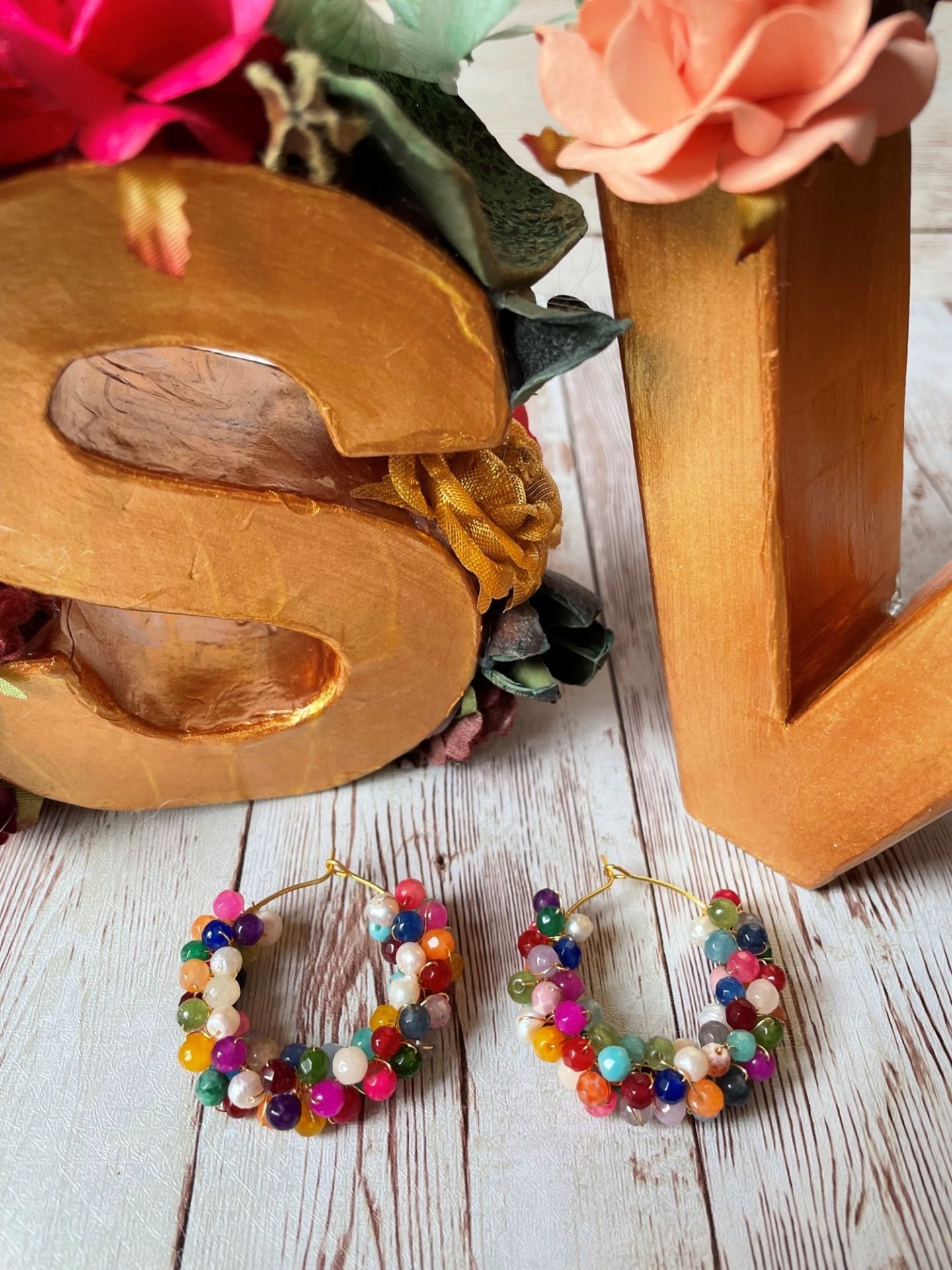 Pendientes de aros dorados con bolitas de piedras naturales multicolor y perlas de río.