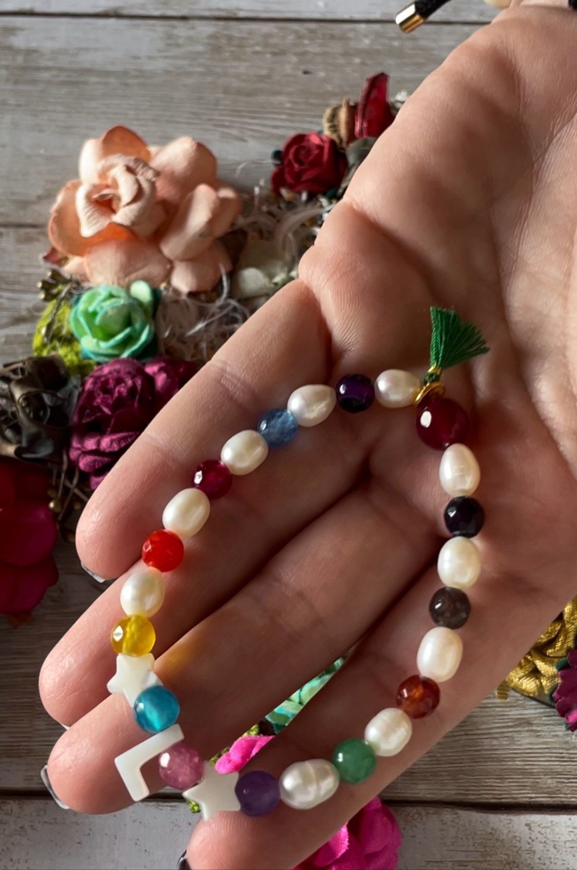 Pulsera elástica hecha con bolas naturales de colores(son de jade) y perlas de río.