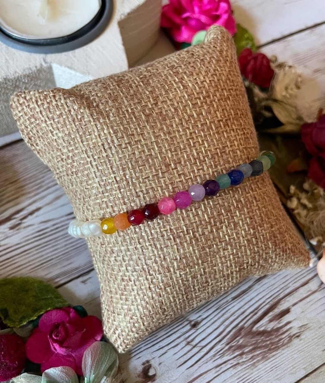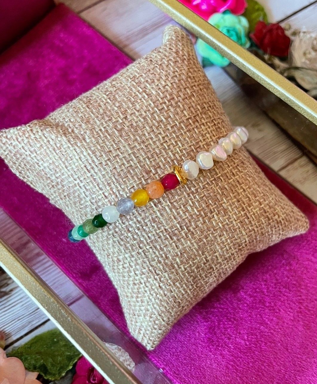 Pulsera elástica hecha con bolitas de jade de colores y perlitas de río.