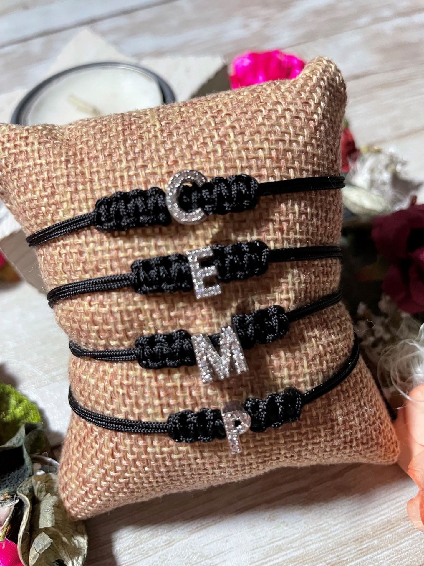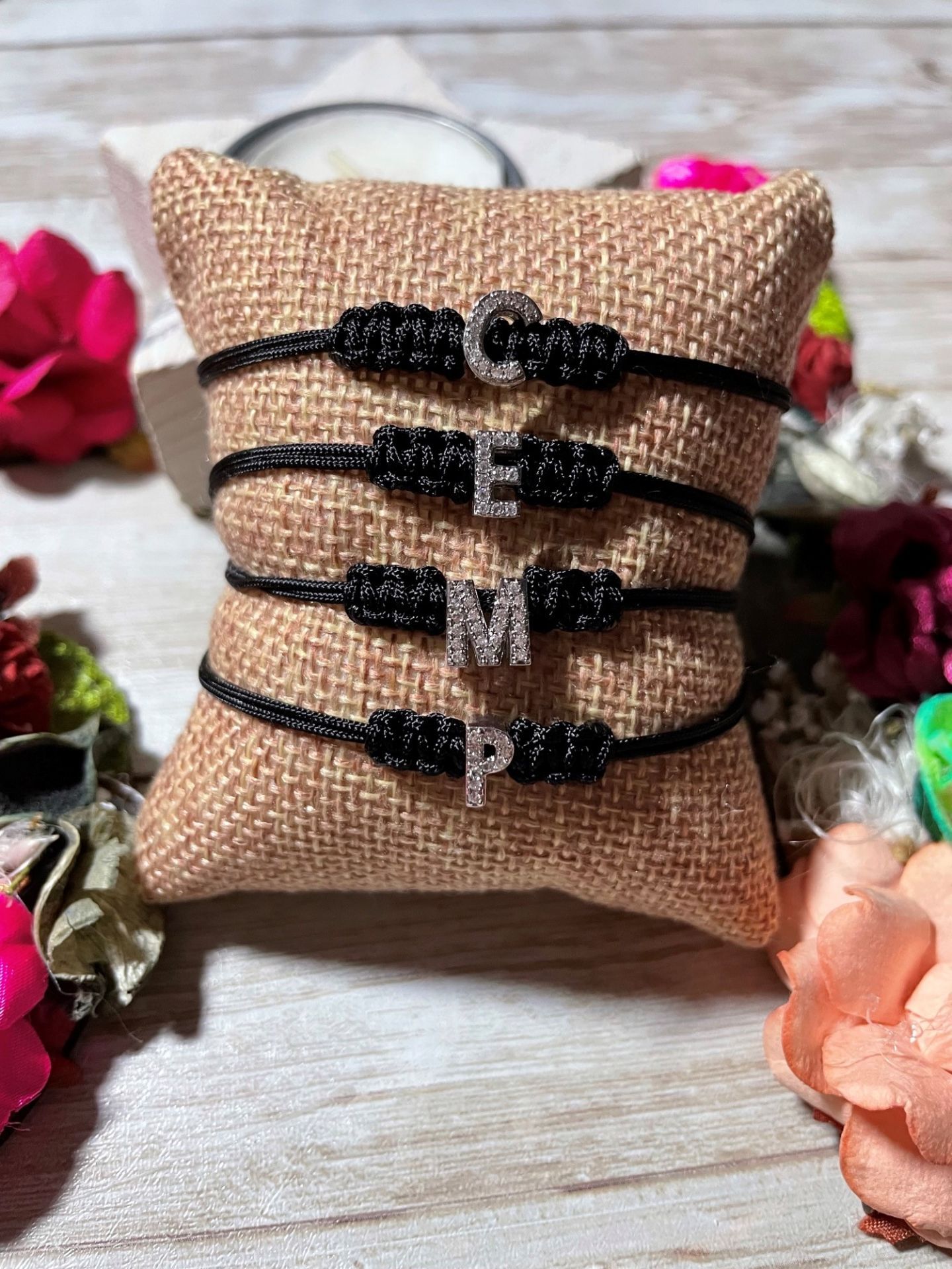 Inicial de acero inoxidable con circonitas cúbicas . Cierre con perlas de río.