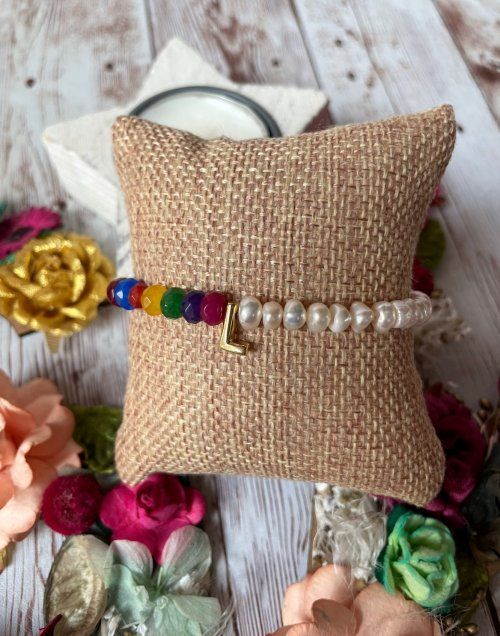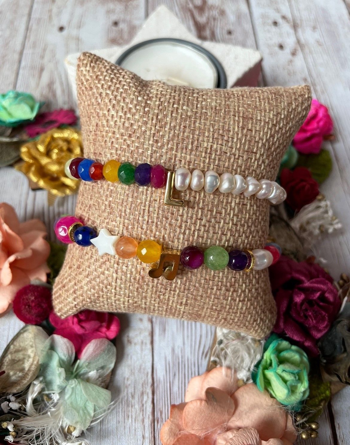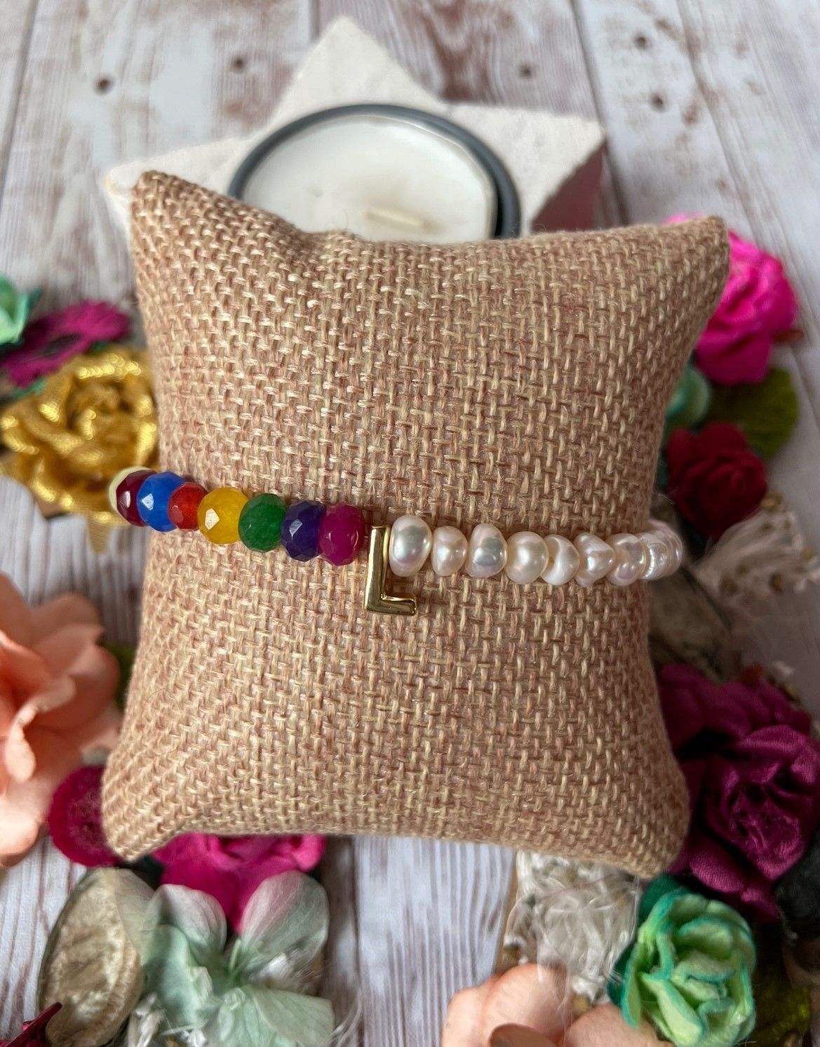 Pulsera elástica hecha con inicial dorada, perlas de río y abalorios de jade.