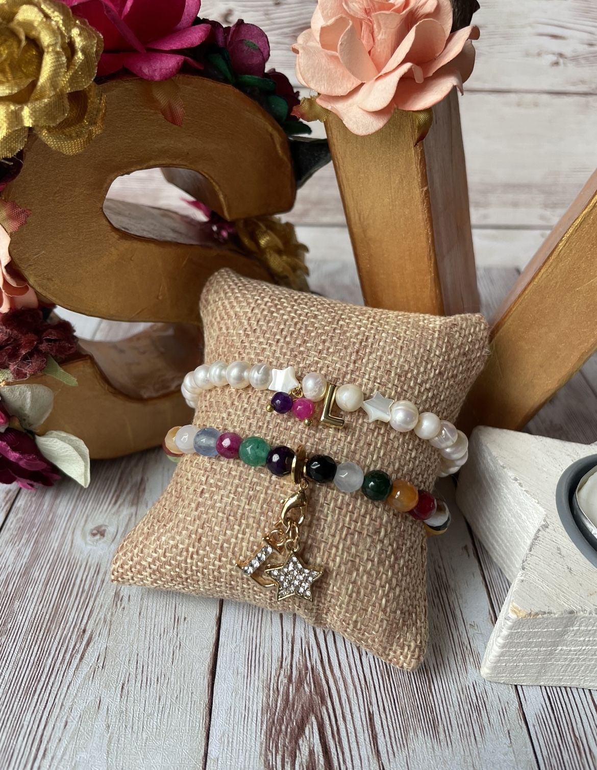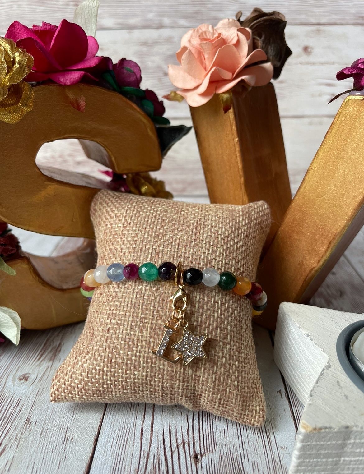 Pulsera elástica hecha con bolas naturales de colores (jade/ágata) para colgante distintos charms. La pulsera tiene de charms la inicial y estrella.