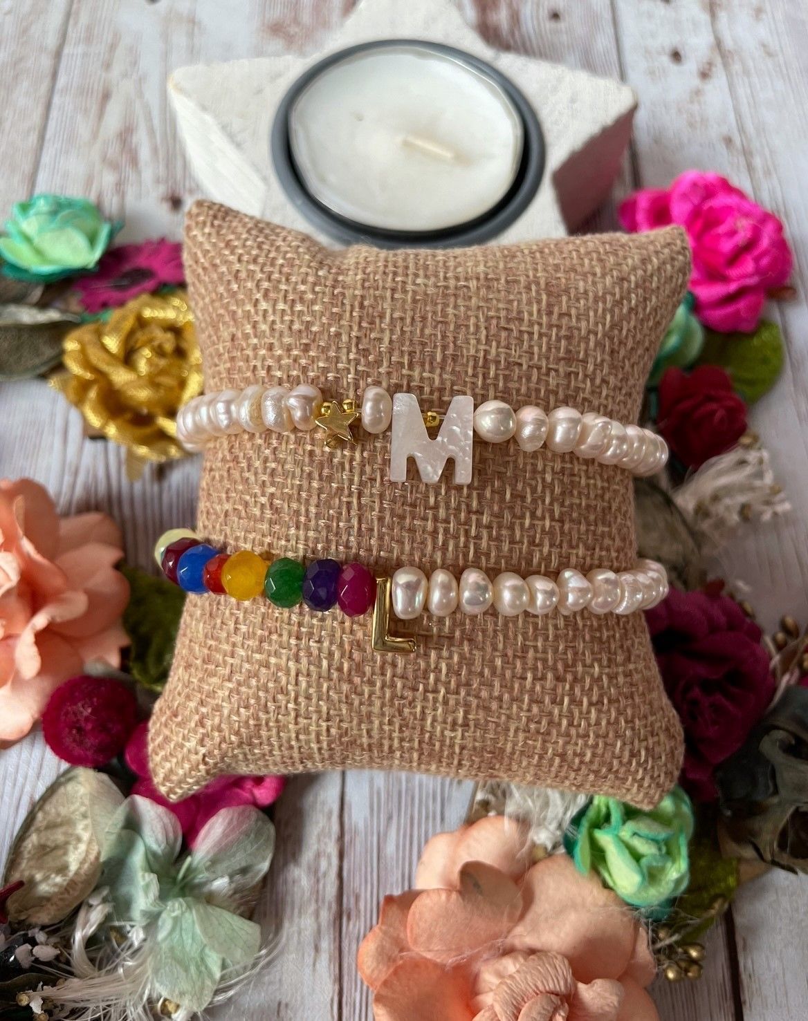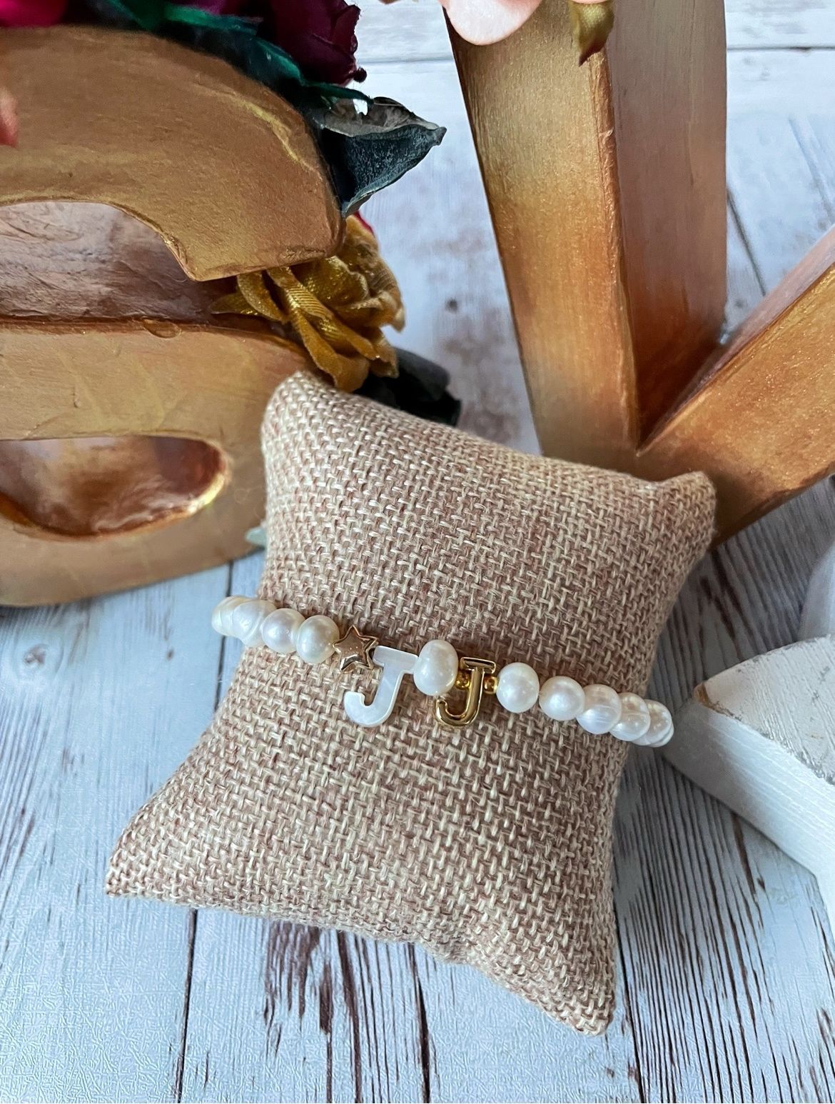 17.jpeg18.jpeg19.jpegPulsera elástica hecha con perlas de río, inicial de nácar y estrella dorada.