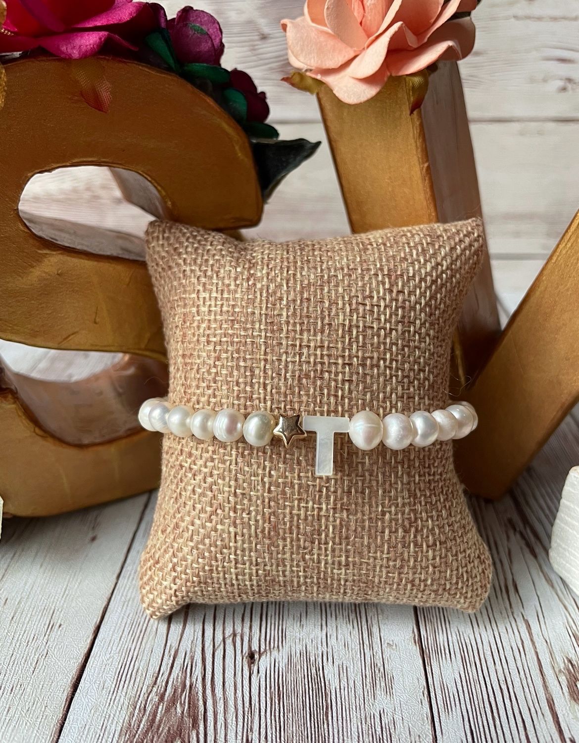 Pulsera de perlas de río con inicial de nácar y estrellita dorada. La pulsera es elástica.