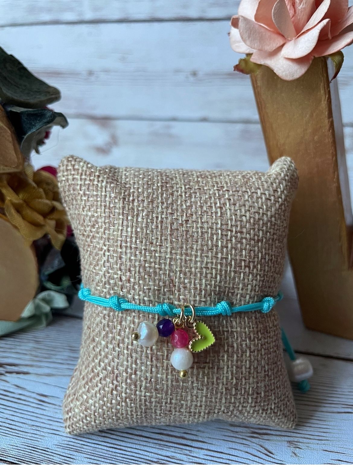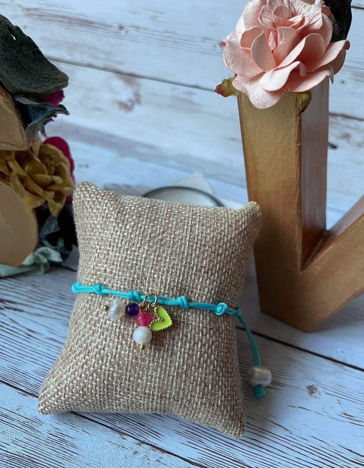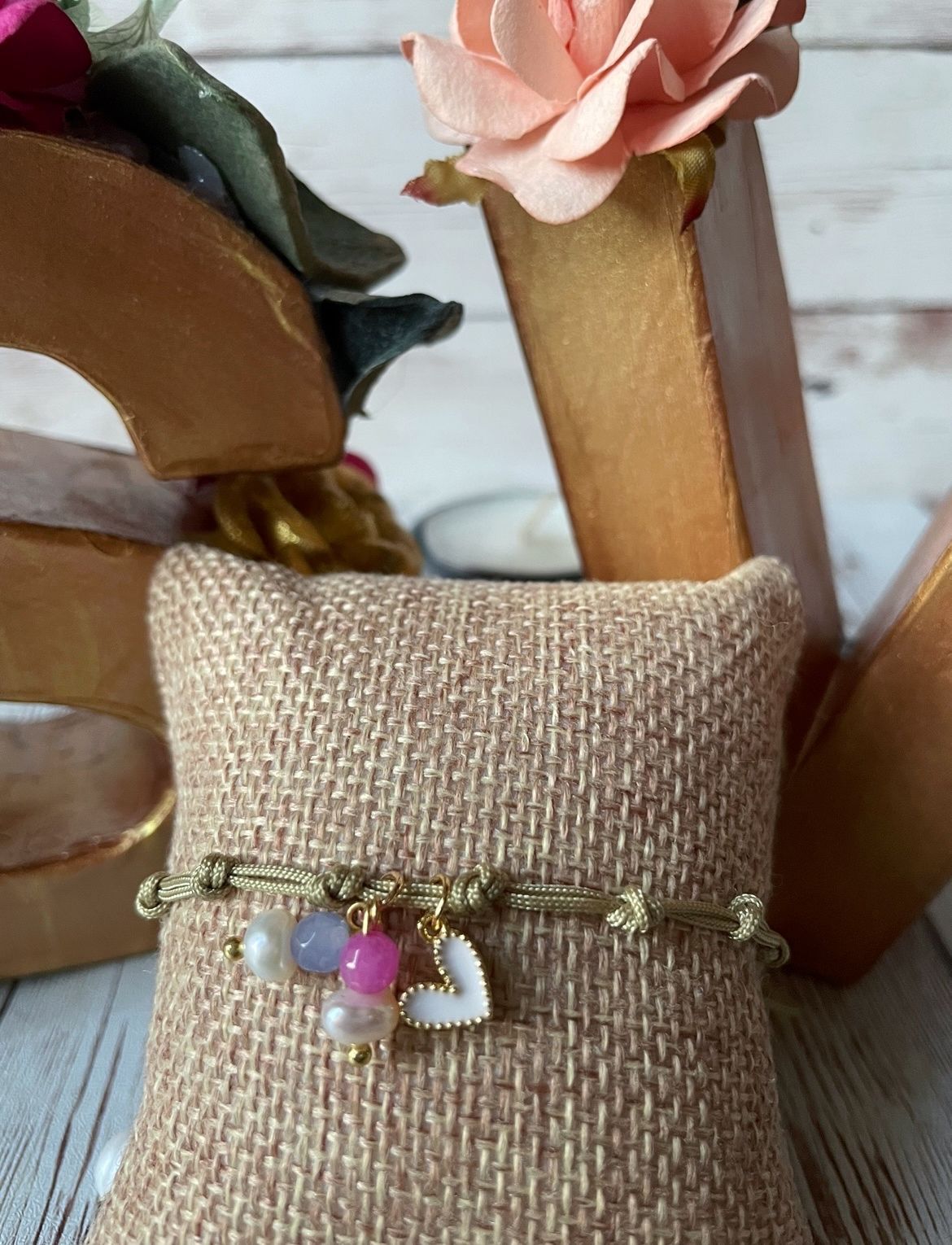 Pulsera hecha con hilo de macramé, charm corazón esmaltado y colgantitos de perlitas y jade.  El cierre es extensible con perlas de río.