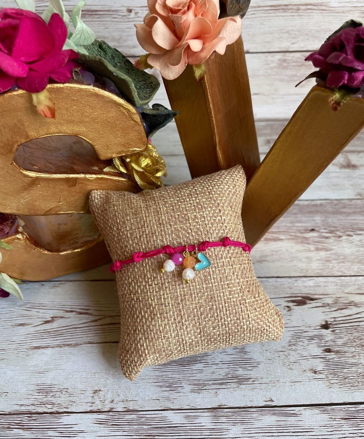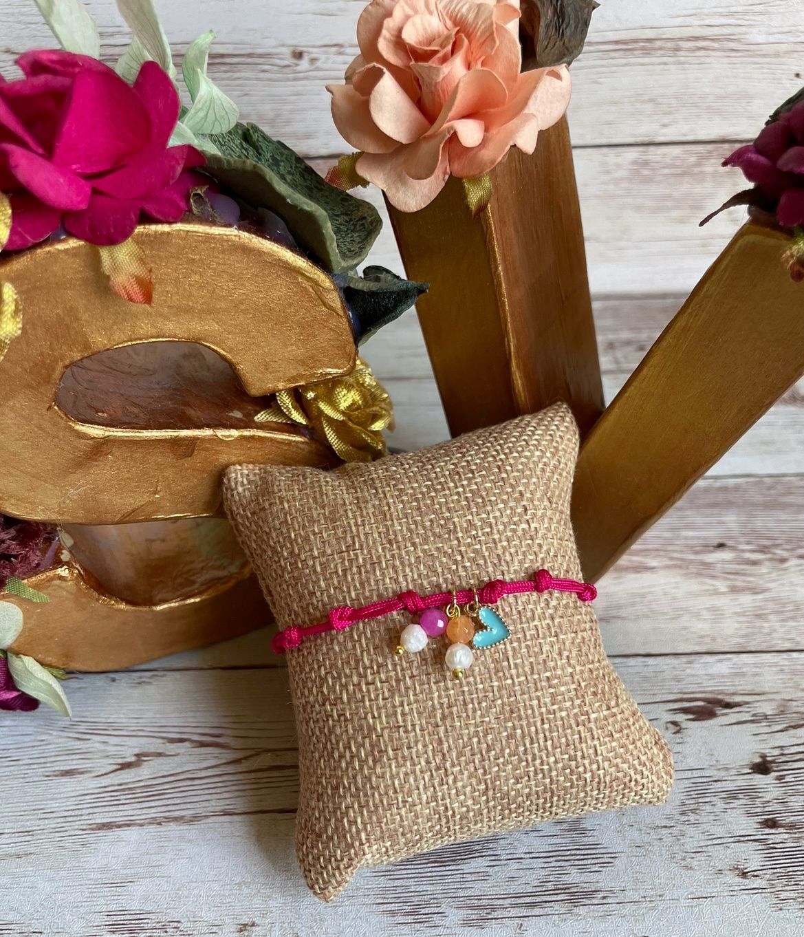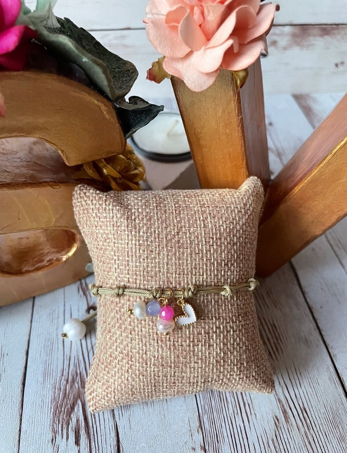 Pulsera hecha con hilo de macramé, charm corazón esmaltado y colgantitos de perlitas y jade.  El cierre es extensible con perlas de río.