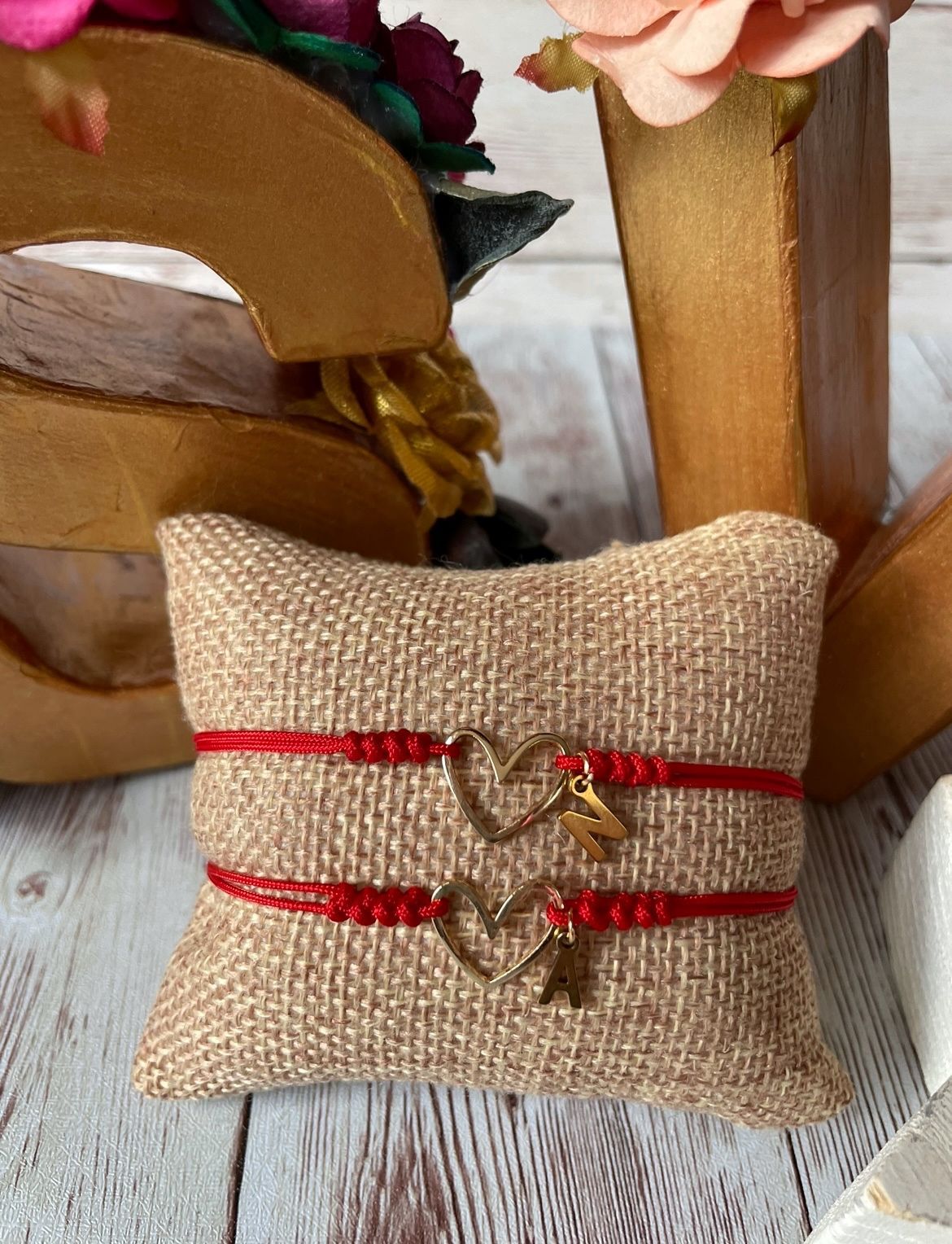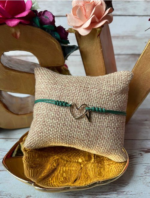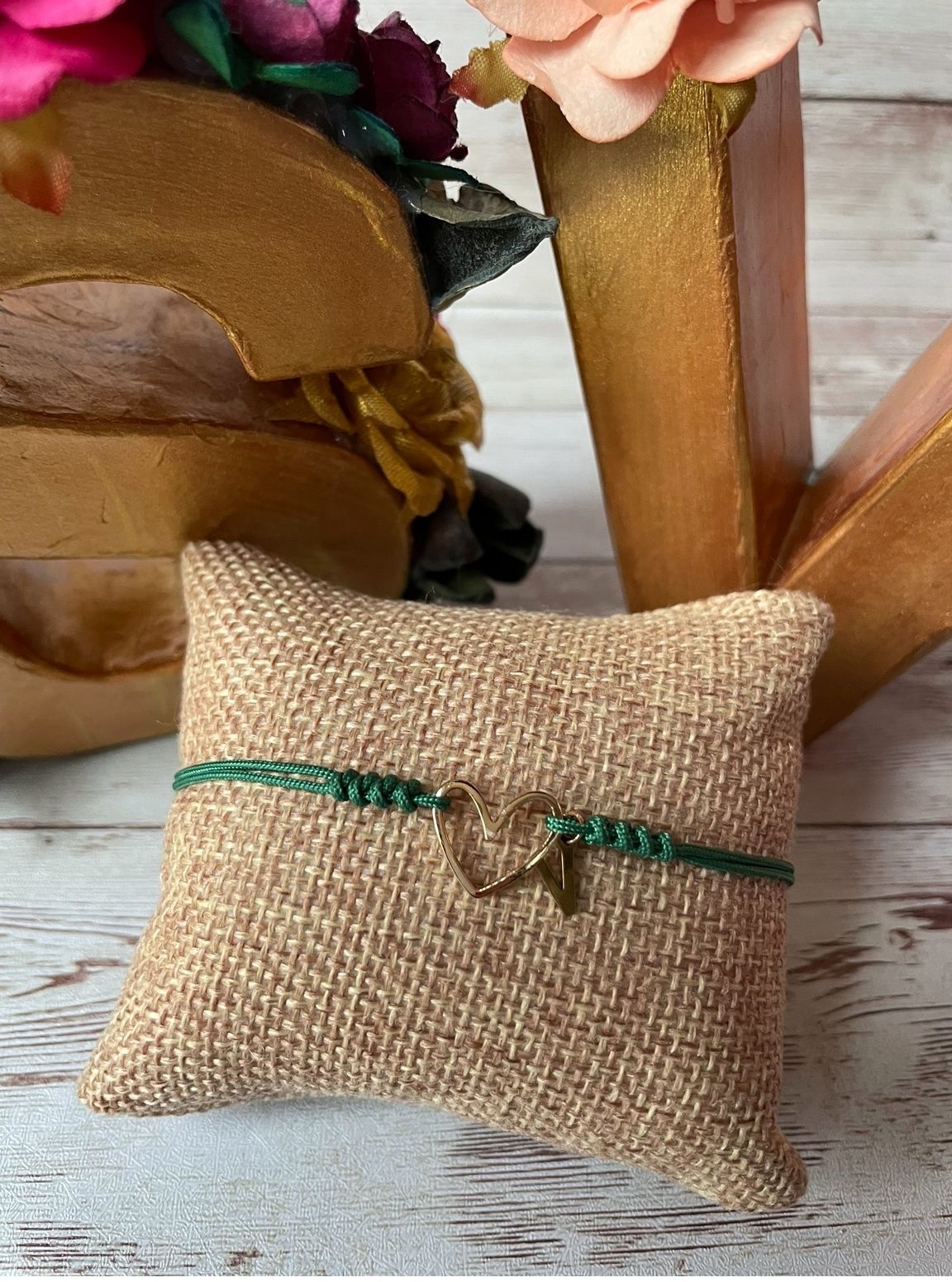 Pulsera hecha de macráme con entrepieza de forma de corazón chapado en oro de 14K y charm de incial colgado en un lateral del corazón. Cierre con perlas de río.