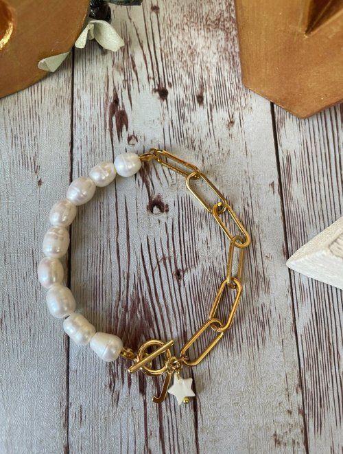 Pulsera hecho con perlas natuales de río, cadena de acero inoxidable en doradoy cierre de latón chapado en oro. Del cierre cuelga una estrellita de nácar y la inicial.